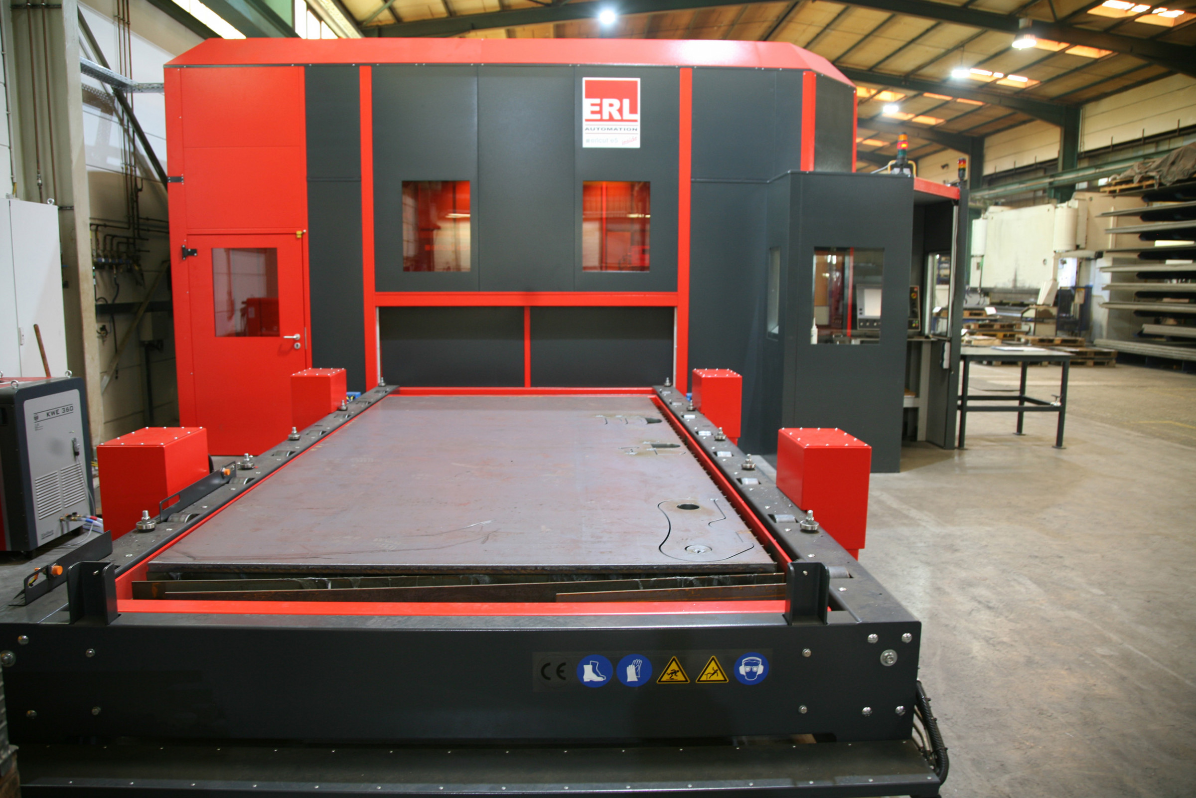 Dank der Schallschutzeinhausung bekommen die Anlagenbediener außerhalb der Kabine davon wenig mit. Die Schallschutzkabine reduziert den Lärm um bis zu 30 db(A), darüber hinaus sind alle relevanten Bedienelemente in einer halboffenen schallgedämmten Bedienzentrale untergebracht. Von dort aus hat das Bedienpersonal sowohl den Schneidprozess als auch die Be- und Entladestation außerhalb der Kabine stets im Blick. Bei der Einrichtung von Blechtafeln werden die Bediener vom Kamerasystem erlcut-cam unterstützt. Eine am Werkzeug angebaute Kamera überträgt ein Live-Bild an die Steuerung und ermöglicht so das schnelle, präzise und lotrechte Erfassen der Kanten.