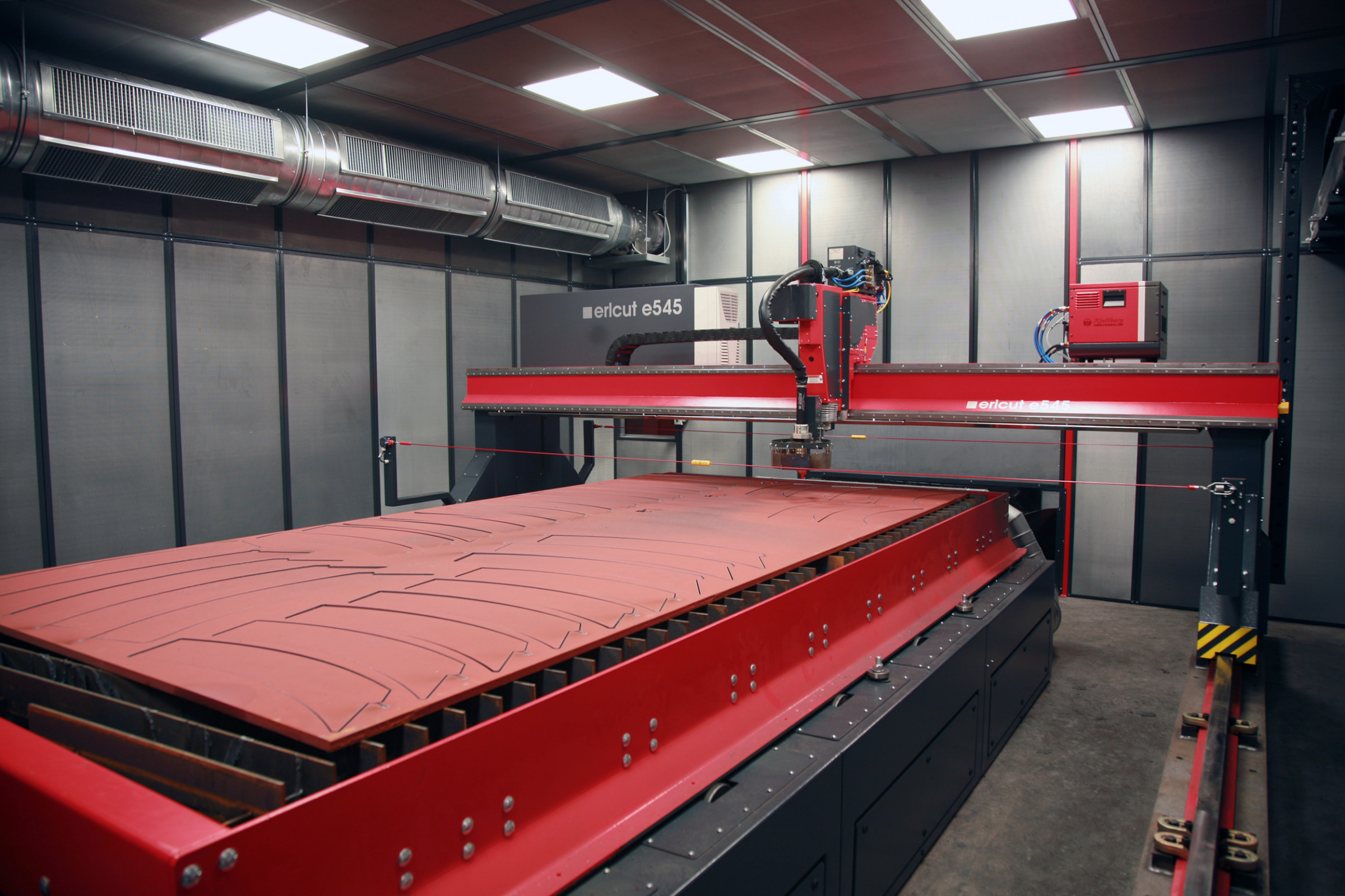 Das Kernstück ist eine Portalschneidanlage des Typs e545 mit einer Spurbreite von 4.500 Millimetern und einer sechs Meter langen Laufbahn. Ausgestattet ist die Maschine mit einem Plasmaschneidbrenner und einer HiFocus 440i neo Stromquelle, die das Schneiden von bis zu 40 Millimeter dicken Blechen ermöglichen. Dabei können Lärmemissionen von bis zu 110 db(A) entstehen.