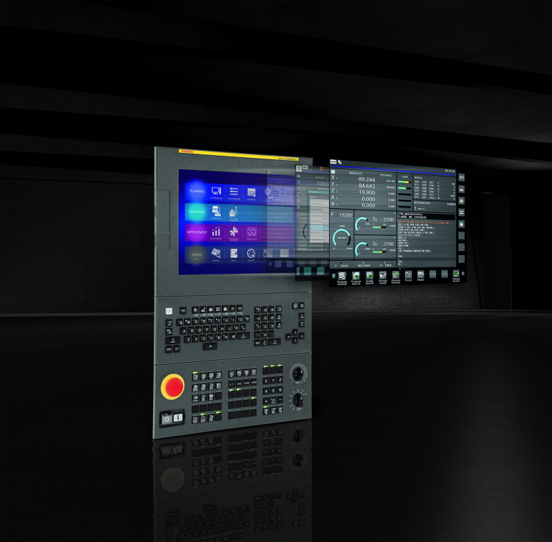 Aufgerüstet hat FANUC bei den Bedieneinheiten: Dem PANEL iH Pro mit 21.5’’ widescreen LCD wurden Prozessoren neuester Bauart spendiert. Sehr praktisch für MTB: PC Unit und Display Unit können nun getrennt voneinander an der Maschine platziert werden. An der Frontseite einer Maschine kann so das Display platzsparend und gestalterisch attraktiv untergebracht werden, während die PC Einheit im Schaltschrank Platz findet. Ein zweites Display an anderer Stelle der Maschine, das man evtl. auf der Rückseite zum Werkzeugwechsel braucht, kann so einfacher in das Maschinengehäuse integriert werden.