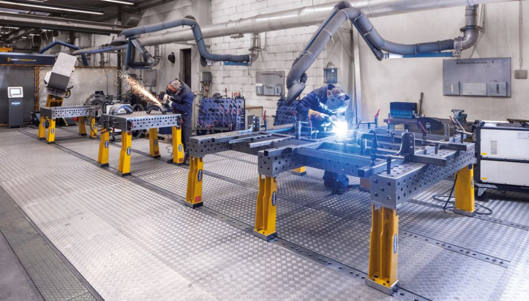 Auch beim Optimieren der Handschweißarbeitsplätze setzt Schulz Fördersysteme auf Innovationen aus dem Hause DEMMELER. Um schnell zwischen kleinen und größeren Baugruppen hin und her zu wechseln, wurden zwei Schienensysteme installiert. Dadurch lassen sich die Arbeitsplätze flexibel verändern. Auf Verschiebefüßen werden sowohl 3D-Schweißtische als auch Distanzwinkel von DEMMELER entsprechend der Werkstückgröße auf dem Schienensystem positioniert. „Bei Bedarf haben wir beispielsweise einen großer Arbeitsplatz oder auch mehrere kleine, je nachdem welche Maße die Baugruppe hat.“, so Stein. Beim Aufspannen der Werkstücke versenken sich die Laufrollen der patentierten DEMMELER Verschiebefüße durch die Last. Dadurch erhält der Fuß einen flächigen Kontakt zur Fundamentschiene. Der Schweißstrom wird nicht über die Laufrollen geleitet und somit wird das Lager nicht beschädigt. Unterschiedliche Aufbauhöhen lassen sich einfach durch verschiedene Tischfußhöhen an das Werkstück anpassen. „Mit dem Verschiebesystem haben wir die Wiederholgenauigkeiten deutlich erhöhen und gleichzeitig unsere Vorrichtungskosten senken können.“ Auch reduziere sich dank der Modularität und Flexibilität des Systems die Rüstzeiten für die unterschiedlichen Bauteiltypen.