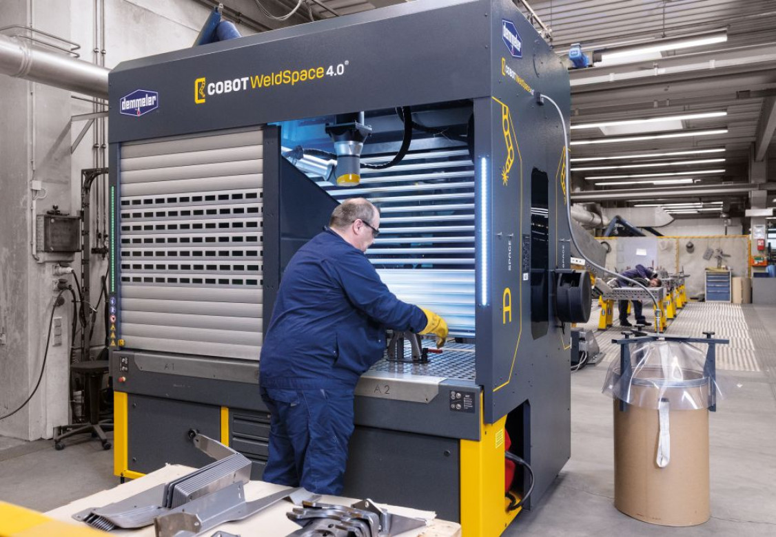 Der Vorteil ist, dass es aufgrund der Automatisierung nicht mehr auf die Fingerfertigkeiten und die persönlichen Fähigkeiten einer einzelnen Person ankommt. Beim Einrichten der Maschine und der Qualitätskontrolle ist der Spezialist natürlich unverzichtbar. Zum Bestücken des programmierten COBOTS muss der Maschinenbediener aber kein 100%iger Schweißer mehr sein.“, erklärt Stein. Mit der DEMMELER COBOT WeldSpace 4.0® können mehrere, teilweise unterschiedliche Teile gleichzeitig geschweißt werden. Das automatische Verfahren der Umhausung ermöglicht das Arbeiten im Mehrstationenbetrieb. Während der Roboter auf der einen Seite schweißt, kann der Bediener geschützt durch herunterfahrbare Rolltore mit Aluminiumpanzer und integriertem Schweißerschutzglas auf der anderen Seite zeitparallel Rüsten und Umspannen (Zwei-Stationen-Betrieb). Eine weitere optionale Unterteilung des vorderen Arbeitsraums (SPACE A) mittels Trennwand schafft sogar einen weiteren Arbeitsplatz (Drei-Stationen-Betrieb). Um alle Arbeitsräume gut zu erreichen, ist der COBOT mittig an der Decke angebracht und fährt mit der Umhausung mit.