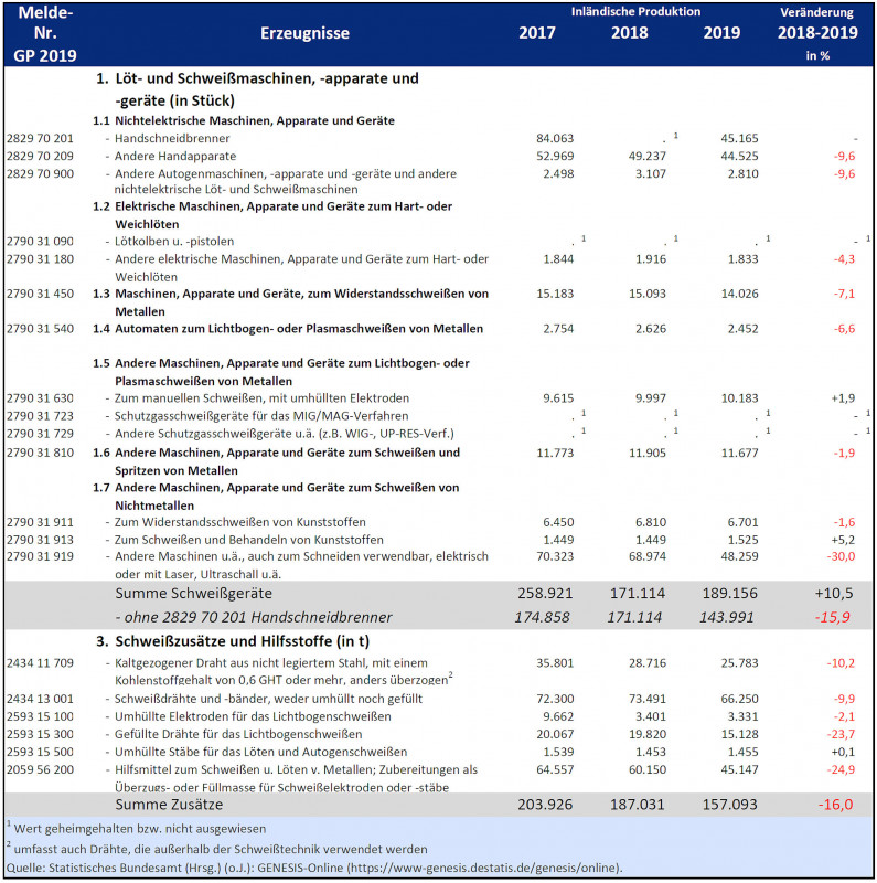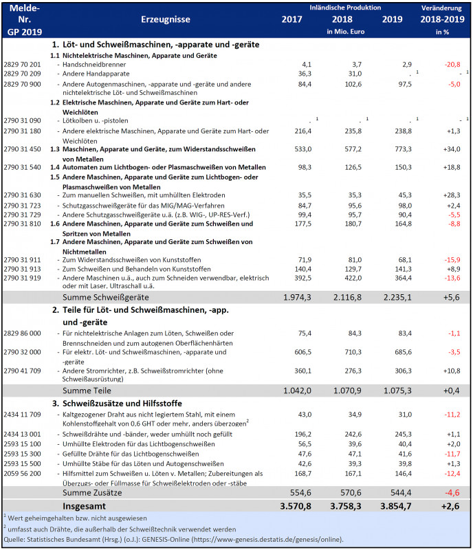 4) Am 1. Januar 2019 ist das „Güterverzeichnis für Produktionsstatistiken, Ausgabe 2019“ (GP 2019) in Kraft getreten. Damit wurde die Ausgabe 2009 (GP 2009) ersetzt. Dadurch wurden in den Tabellen 1 und 2 unter „Löt- und Schweißmaschinen, -apparate und -geräte“ in Punkt 1.7 Anpassungen erforderlich.