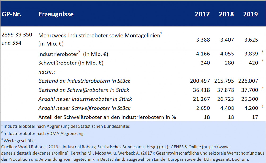 Der Produktionswert von Mehrzweck-Industrierobotern sowie Montagelinien wuchs um 6,4 Prozent und erreichte einen Wert von 3,63 Mrd. Euro, Tabelle 3. Bei den Industrierobotern nahm der (geschätzte) Produktionswert um 5,3 Prozent auf 3,84 Mrd. Euro ab. Für die Schweißroboter wurde 2019 ein Produktionswert von 420 Mio. Euro geschätzt. Ihr (geschätzter) Bestand ging leicht auf 37.700 Stück zurück (Vorjahr: 37.878). 17 Prozent aller Industrieroboter waren im Jahr 2019 Schweißroboter.