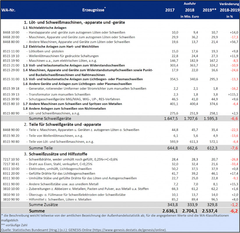 Die Ausfuhren schweiß- und schneidtechnischer Güter nahmen 2019 um 6,2 Prozent ab und erreichten einen Wert von 2,54 Mrd. Euro, Tabelle 4. Den stärksten Rückgang verzeichneten die Teile für Schweißgeräte und -apparate (-7,6Prozent auf 612,3 Mio. Euro), gefolgt von den Löt- und Schweißmaschinen, -apparaten und -geräten. Hier ging der Exportwert um 6,6 Prozent auf 1,595 Mrd. Euro zurück. Die geringste Abnahme erfolgte mit -1,2 Prozent bei den Schweißzusätzen und Hilfsstoffen. Der Ausfuhrwert sank auf 329,8 Mio. Euro.