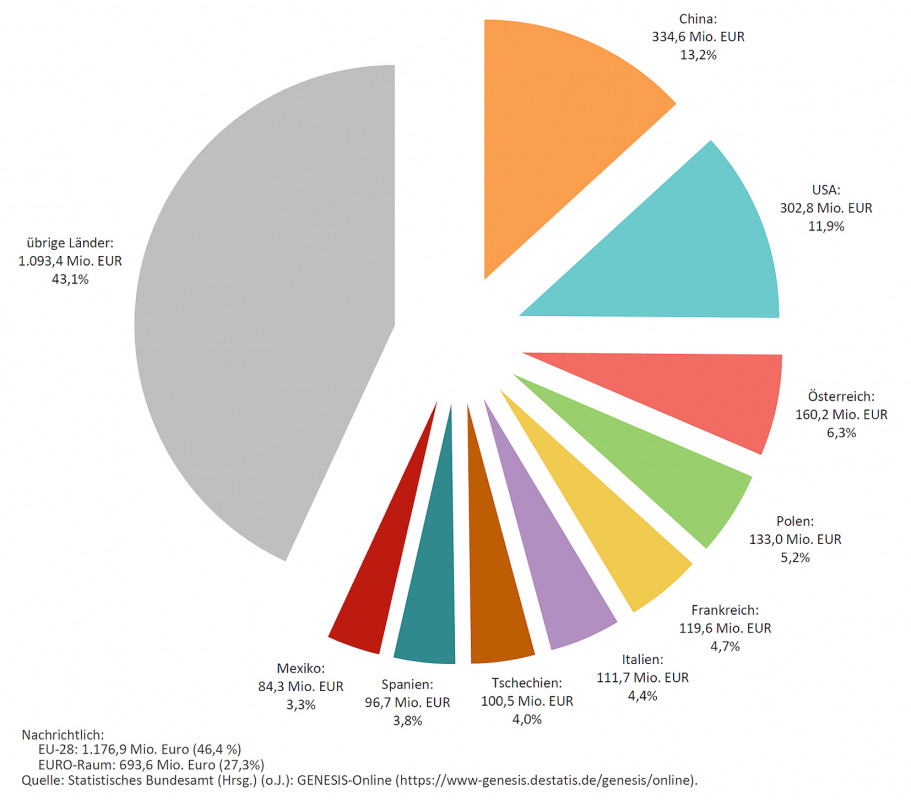 In die zehn Hauptabnehmerländer flossen knapp 60 Prozent der Ausfuhren. Im Einzelnen handelt es sich dabei neben China, den USA und Österreich um Polen, Frankreich, Italien, Tschechien, Spanien, Mexiko und Ungarn. Die Exporte nach Polen gingen gegenüber 2018 um 9,9 Prozent auf 133,0 Mio. Euro zurück, die nach Italien um 10,3 Prozent auf 111,7 Mio. Euro. Abgenommen haben auch die Lieferungen nach Tschechien und Mexiko.
