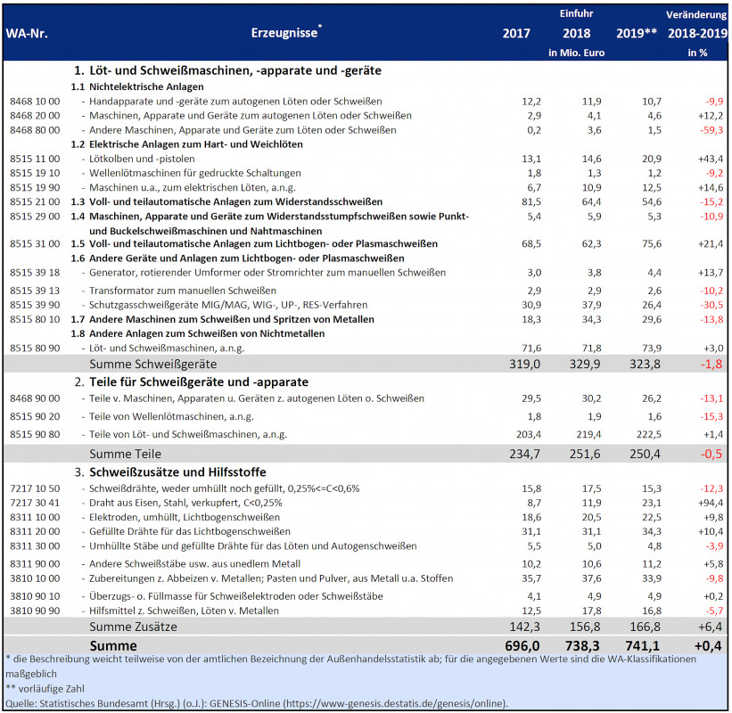 - „Andere Maschinen, Apparate und Geräte zum Lichtbogen- oder Plasmaschweißen von Metallen: Schutzgasschweißgeräte für das MIG/MAG-Verfahren“ (84,7 Mio. Euro; 95,6 Mio. Euro; 98,0 Mio. Euro)