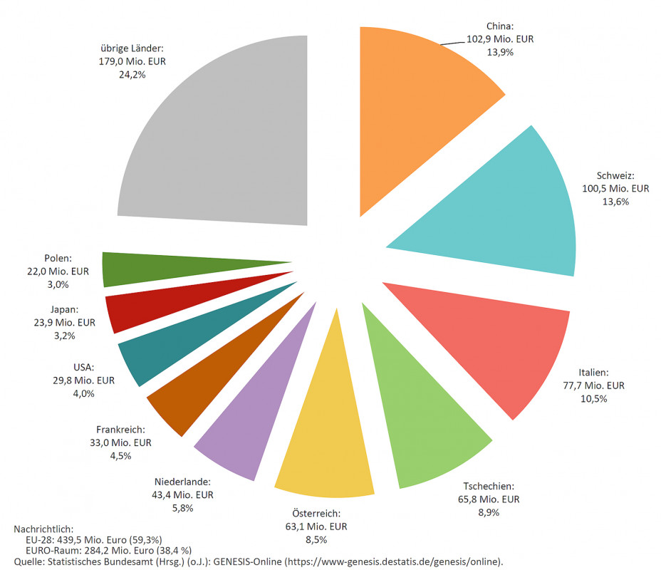 Werden Tschechien, Österreich, die Niederlande, Frankreich und die Vereinigten Staaten mit betrachtet, dann lieferten acht Staaten rund zwei Drittel der deutschen Importe (69,7 Prozent). Aus China wurden Waren im Wert von 102,9 Mio. Euro bezogen, was gegenüber 2018 einen Zuwachs von +7,4 Prozent bedeutet. Der Importanteil lag mit 13,9 Prozent um 0,9 Prozent-Punkte über dem Anteil des Vorjahres.