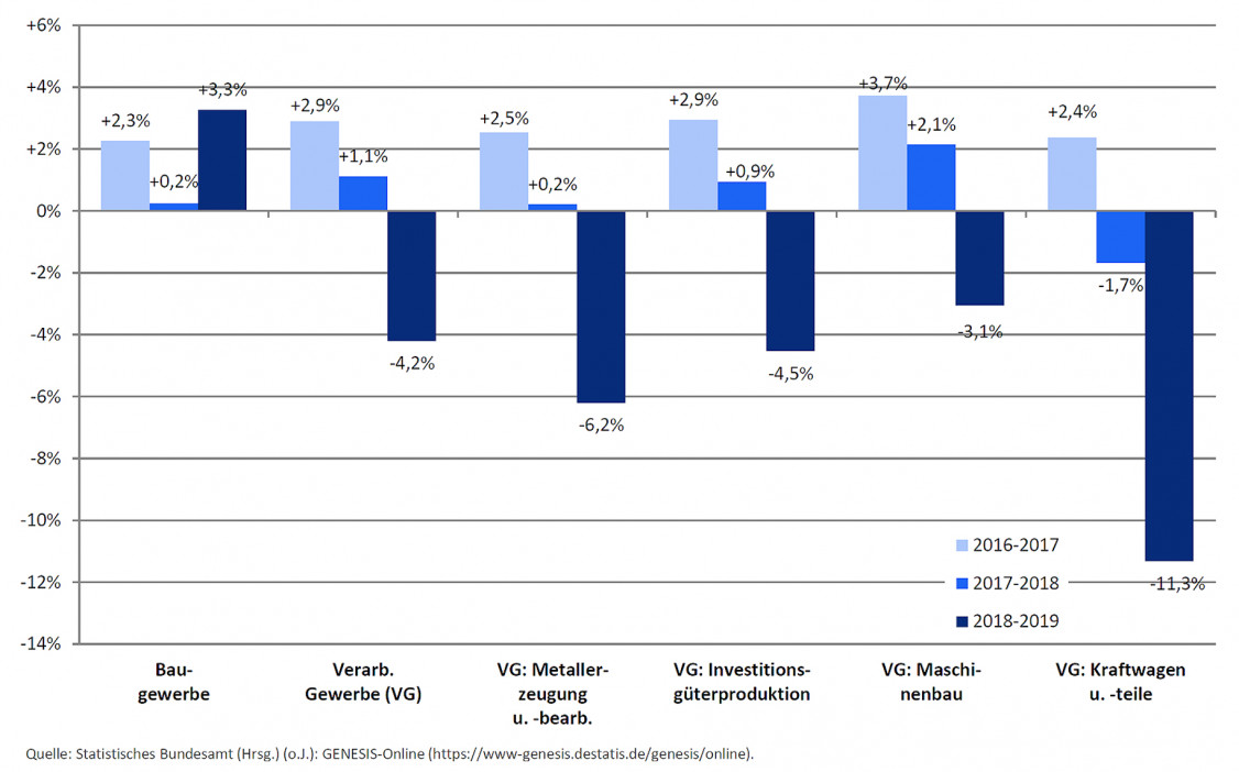In Deutschland erreichte die Wirtschaft im vergangenen Jahr ein Plus von 0,6 Prozent. Damit verzeichnete die deutsche Volkswirtschaft nach einem langen Aufschwung eine Schwächephase. Gründe waren die weltweit zurückgehende Industriekonjunktur und ein rückläufiger Welthandel. Wegen der internationalen Handelskonflikte und einer höheren politischen Unsicherheit nahm die Auslandsnachfrage nach Investitionsgütern ab. Auch der Fahrzeugbau ließ weltweit nach. Insgesamt nahmen die Exporte dennoch um 0,9 Prozent zu. Infolge der engen Verknüpfung von Investitionen in Deutschland mit der Außenhandelsenwicklung wuchsen die Ausrüstungsinvestitionen nur um 0,6 Prozent. Die Bauinvestitionen nahmen dagegen um 3,9 Prozent zu, unter anderem bedingt durch die weiterhin hohe Nachfrage nach Wohnraum in den Ballungsgebieten. Der Wohnungsbau wuchs um 4,1 Prozent. Im Nichtwohnungsbau war beim gewerblichen Bau nur ein Plus von 2,5 Prozent zu verzeichnen, während der öffentliche Bau um 6,2 Prozent zulegte.