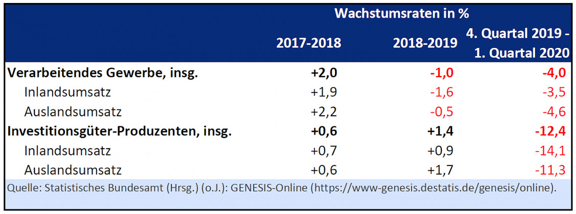 Unter diesen Voraussetzungen sind Prognosen einerseits vielfältig, verlieren andererseits aber schnell an Relevanz. Der Einbruch der Wirtschaftsleistung in Deutschland in den ersten Monaten des Jahres 2020 zeigt sich an verschiedenen Indikatoren. Der Umsatz im Verarbeitenden Gewerbe und bei den Investitionsgüterproduzenten ist im ersten Quartal gegenüber dem vierten Quartal 2019 kräftig zurückgegangen (Tabelle 6).