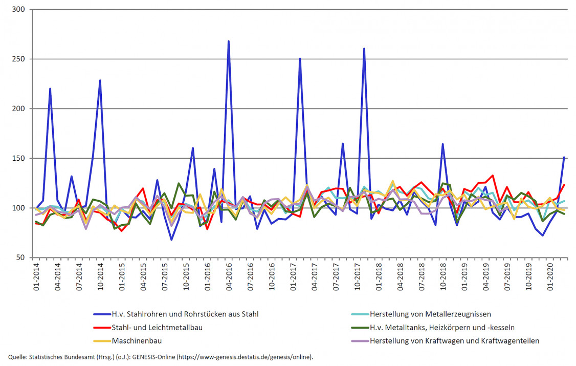 Die Auftragseingänge zeigten bereits über das ganze Jahr 2019 hinweg eine leicht rückläufige Tendenz, die sich Anfang 2020 – abgesehen vom Stahl- und Leichtmetallbau und bei den Herstellern von Stahlrohren und Rohrstücken aus Stahl – fortgesetzt hat (Bild 4). Die Wachstumsprognosen für Deutschland schwanken erheblich in der Zeit und zwischen den erstellenden Institutionen. So ging die Projektgruppe Gemeinschaftsdiagnose im April 2020 von einem Rückgang der Wirtschaftsleistung von nur 4,2 Prozent aus, das Deutsche Institut für Wirtschaftsforschung erwartete im Juni ein Minus von 9,4 Prozent. Das Münchner ifo Institut prognostizierte im Juli -6,7 Prozent. Ebenso unterschiedlich fallen die – bisher allerdings durchweg positiven – Wachstumserwartungen für das Jahr 2021 aus.