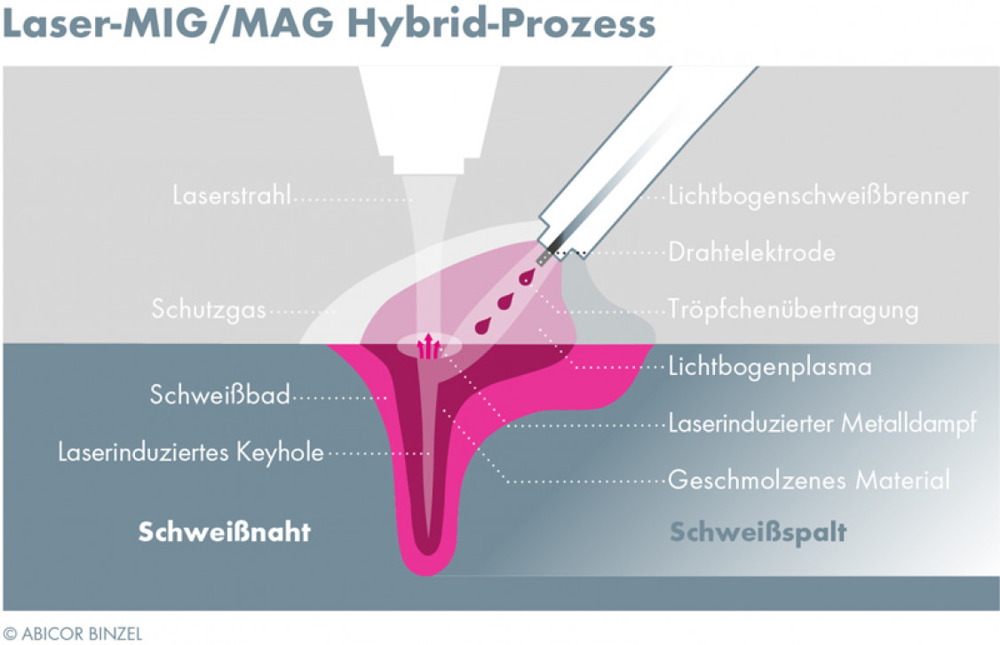 Werden hohe Geschwindigkeit und Präzision benötigt, wird in der Regel das Laserschweißen genutzt. Vor allem in der Automobilindustrie hat sich dieses Verfahren durchgesetzt. Das MIG-Laser-Hybrid-Verfahren kombiniert den Laser- und den MIG-Schweißprozess. Dabei treffen ein fokussierter Laserstrahl und der MIG-Lichtbogen im gleichen Moment auf die zu schweißende Naht. Die Vorteile dieses Verfahrens sind seine hohe Stabilität, seine hohe Abschmelzleistung und sein hoher thermischer Wirkungsgrad.