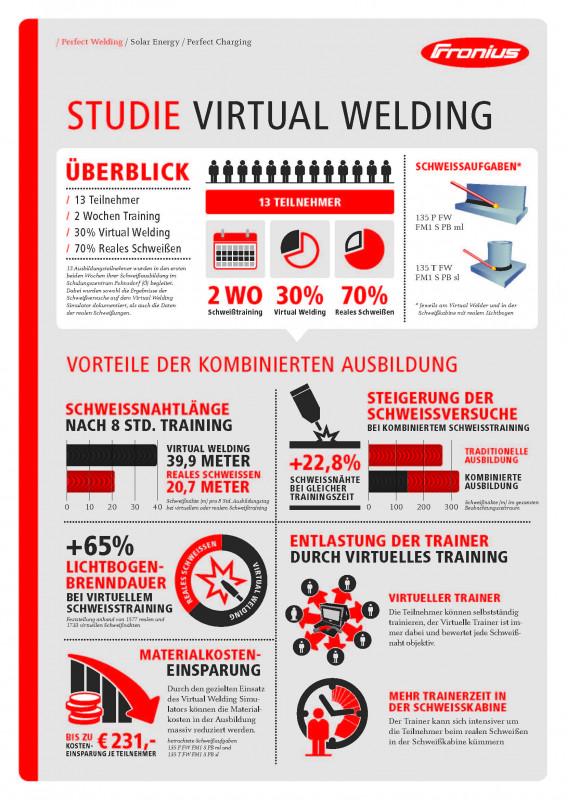 Fronius setzt mit Virtual Welding auf ein durchdachtes Ausbildungskonzept. Unter anderem wird Theoriewissen über die Prozesse E-Hand, WIG und MIG/MAG vermittelt, als auch in Wissensüberprüfungen abgefragt. Eine Rangliste spornt die Schulungsteilnehmer dabei an, sich spielerisch miteinander zu messen. Im Fronius-Lehrplan für Virtual Welding sind die praktischen Schweißaufgaben an die Ausbildung des International Institute of Welding angelehnt. Dadurch entsprechen sie dem internationalen Standard für die Ausbildung von Schweißern.