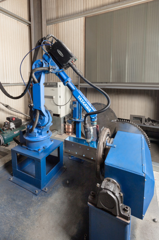 Als Positionierer dient ein Standard-Dreh-Kipptisch DK-1500 von Yaskawa. Während die Drehachse endlos drehend ausgeführt ist, liegt die Bewegungsfreiheit der Kippachse bei +/- 90 Grad. Der DK-1500 ist beidseitig gelagert und verfügt über eine maximale Traglast von 1.500 kg, so dass es hier keine Einschränkungen für schwere Werkstücke gibt. Die Steuerung der acht Achsen – sechs vom Roboter und zwei vom Positionierer – übernimmt der bewährte Yaskawa Controller DX100.