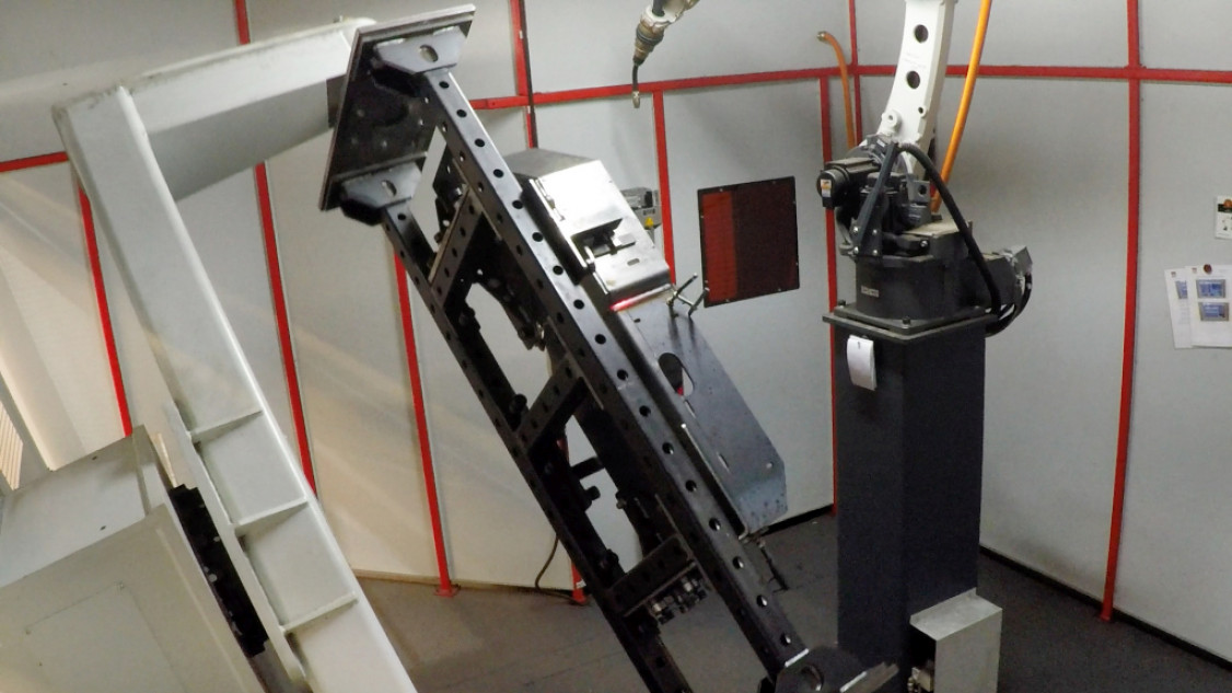 Das Anlagenkonzept sieht einen 2-Stationen-Betrieb vor. Dafür kommt ein elektrisch betriebener 180° Takttisch zum Einsatz, der die Bauteile dem Arbeitsbereich des Roboters zuführt. Auf beiden Tischseiten kann jeweils eine Schweißvorrichtung zur Aufnahme von Bauteilen angebracht werden. Die beiden Stationen sind durch einen Blendschutz voneinander getrennt, sodass der Roboter auf einer Seite schweißen kann, während der Bediener auf der anderen Seite die fertigen Bauteile entnehmen und die Vorrichtung neu bestücken kann. Auf beiden Tischseiten stehen zudem externe Zusatzachsen zur Verfügung, die es ermöglichen, die Stationen um jeweils 180° zu wenden. Für eine optimale Zugänglichkeit des Roboters ist die Tischseite zum Arbeitsbereich hin erhöht. Zur Einlegeseite hin fällt sie ab, sodass die Bauteile auch für den Bediener gut erreichbar sind. Bei Bedarf kann das Bedienpersonal auch die externe Achssteuerung nutzen, um die Vorrichtung im Einlegebereich in eine noch komfortablere Position für die Be- und Entladung zu bringen - auch wenn gleichzeitig auf der anderen Achse das Roboterschweißprogramm läuft. Die benötigten Schweißvorrichtungen produziert Thaler selbst. Damit erreicht das Unternehmen ein Höchstmaß an Flexibilität, denn so kann die Fertigung auf der Schweißroboteranlage beliebig erweitert werden.