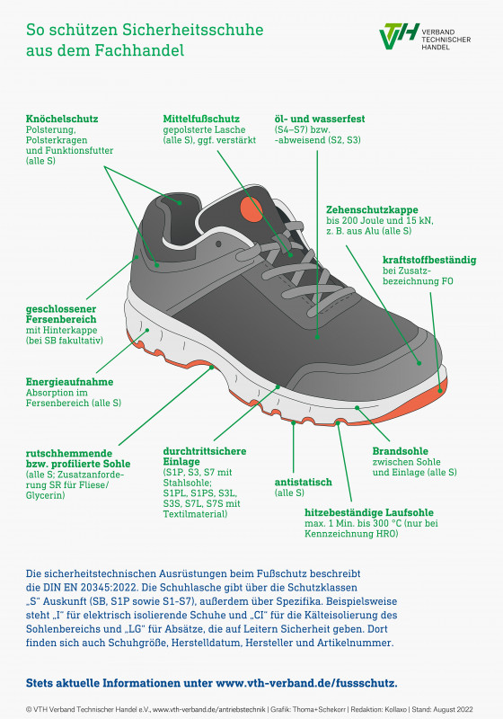 Die wichtigsten Elemente eines Sicherheitsschuhs, auf die Unternehmen achten sollten, haben Experten im VTH Verband Technischer Handel e.V. in der Infografik „So schützen Sicherheitsschuhe“ aufbereitet – vom Knöchelschutz und dem geschlossenen Fersenbereich bis hin zur Zehenschutzkappe. Die sicherheitstechnischen Ausrüstungen beim Fußschutz beschreibt die Norm EN ISO 20345:2022. Die Schuhlasche gibt über die Schutzklassen „S“ Auskunft (SB, S1P sowie S1-S7), außerdem über Spezifika. Beispielsweise steht „I“ für elektrisch isolierende Schuhe, „CI“ für die Kälteisolierung des Sohlenbereichs und „LG“ für Absätze, die auf Leitern Sicherheit geben. Auf der Lasche finden sich auch Schuhgröße, Herstelldatum, Hersteller und Artikelnummer.