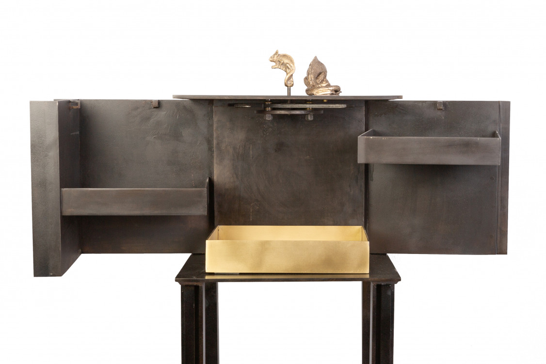 Begründung der Jury: Loki Frey beweist mit seinem Schmucktresor eine handwerkliche Hingabe mit exzellenter technischer Ausführung. Über ein einfaches Schließsystem lassen sich im ersten Schritt eine Wand und im Zweiten zwei weitere zusammenhängende Wände öffnen. Diese weisen je eine Ablage zur Aufbewahrung von Schmuck oder anderem auf. Ebenso wird eine Ablage aus Messing, die sich auf dem Boden des Quaders befindet, preisgegeben. Sicherlich wird in dieser das Besondere aufbewahrt. Geradezu poetisch wacht ein Chamäleon im geschlossenen Zustand über den Verschluss, der erst nach wegdrehen dieser Figur das Schlüsselloch freigibt, um den Schlüssel – ebenfalls mit einem aus Messing/Bronze gegossenem Chamäleon versehen – eintauchen lassen zu können. Erst danach entfaltet sich das Geheimnis dieses Werkes.