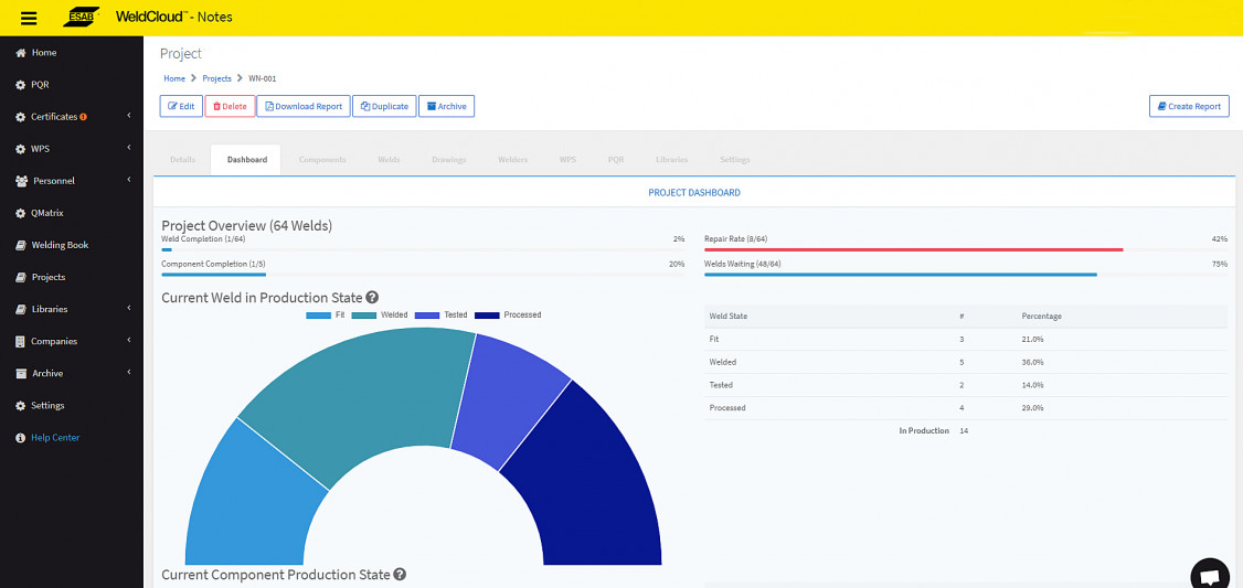 WeldCloud Notes bietet die vollständige Einhaltung von Bauvorschriften (ASME VIII, ASME B31.3, EN 1090), Schweißstandards (ASME IX, ISO 15614-1, ISO 9606, AWS D.11) und Schweißqualitätsstandards (EN 3834). Es ermöglicht Produzenten die Nachverfolgung der Produktivität von einzelnen Schweißsystemen und Schweißern, die Eingabe von Schweißnahtdaten und das Management von Kalibrierungsdatensätzen für einen ganzen Fuhrpark von Schweißmaschinen.