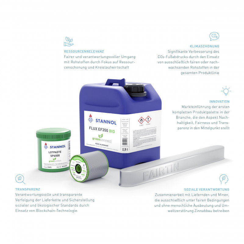 Für Produkte der Löttechnik wird vor allem der Rohstoff Zinn benötigt, der für die deutsche Industrie von großer Bedeutung ist. In den Abbaugebieten herrschen oft problematische Arbeits- und Lebensbedingungen und die Umwelt wird stark beeinträchtigt. Diesem Problem hat sich Stannol angenommen und die nachhaltigere Produktlinie „greenconnect“ auf den Markt gebracht. Im Rahmen der Produktreihe werden Lotbarren, Lötdraht, Lotpaste und Flussmittel auf Basis von fairem bzw. recyceltem Ausgangsmaterial oder nachwachsenden Rohstoffen hergestellt, angeboten und verkauft. Die greenconnect-Serie wurde 2019 auf dem Markt eingeführt und übernimmt seither eine Vorbildfunktion.