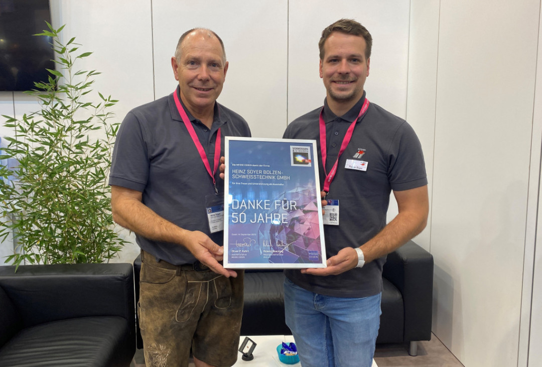 Diese Urkunde haben sie sich verdient: Die Heinz Soyer Bolzenschweißtechnik GmbH wurde am 14. September 2023 für ihre 50-jährige Teilnahme an der Weltleitmesse SCHWEISSEN & SCHNEIDEN geehrt.
