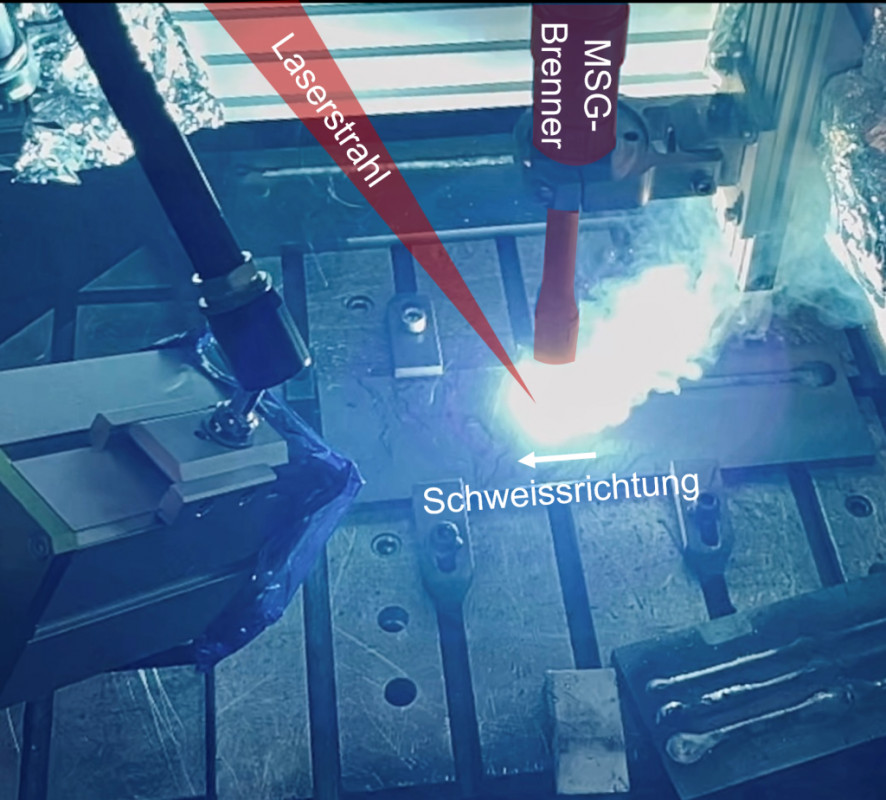 Beim Schweißen von dicken Blechen müssen teils große Nahtfugen aufgefüllt werden. Ziel des Projekts „ÖkoHybrid” ist es daher, durch die Zufuhr von relativ dickem Draht mit einem Durchmesser von 3 mm die Naht mit weniger Lagen schließen zu können. Dadurch soll der Fügeprozess deutlich schneller und ressourcenschonender werden. Ein mitlaufender Laserstrahl soll dabei den Prozess beschleunigen und stabilisieren.