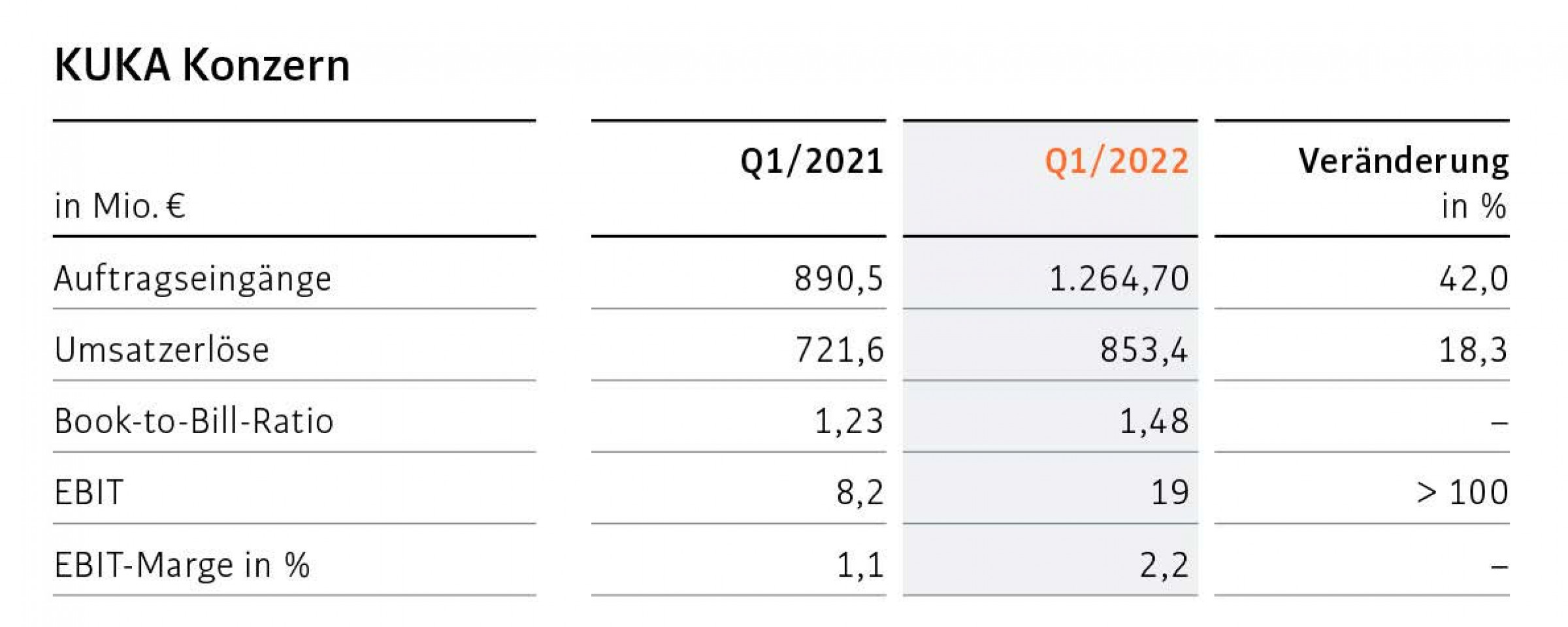 KUKA ist erfolgreich in das neue Geschäftsjahr gestartet und steigerte zwischen Januar und März 2022 Auftragseingang und Umsatz deutlich. Der KUKA Konzern verzeichnete mit knapp 1,3 Mrd. € um 42,0 % mehr Aufträge (Q1/21: 890,5 Mio. €) und die Umsätze stiegen um 18,3 % auf 853,4 Mio. € (Q1/21: 721,6 Mio. €). Zudem steigerte KUKA das Ergebnis vor Zinsen und Steuern (EBIT) auf 19,0 Mio. € (Q1/21: 8,2 Mio. €), mit einer EBIT-Marge von 2,2 % (Q1 / 21: 1,1 %).