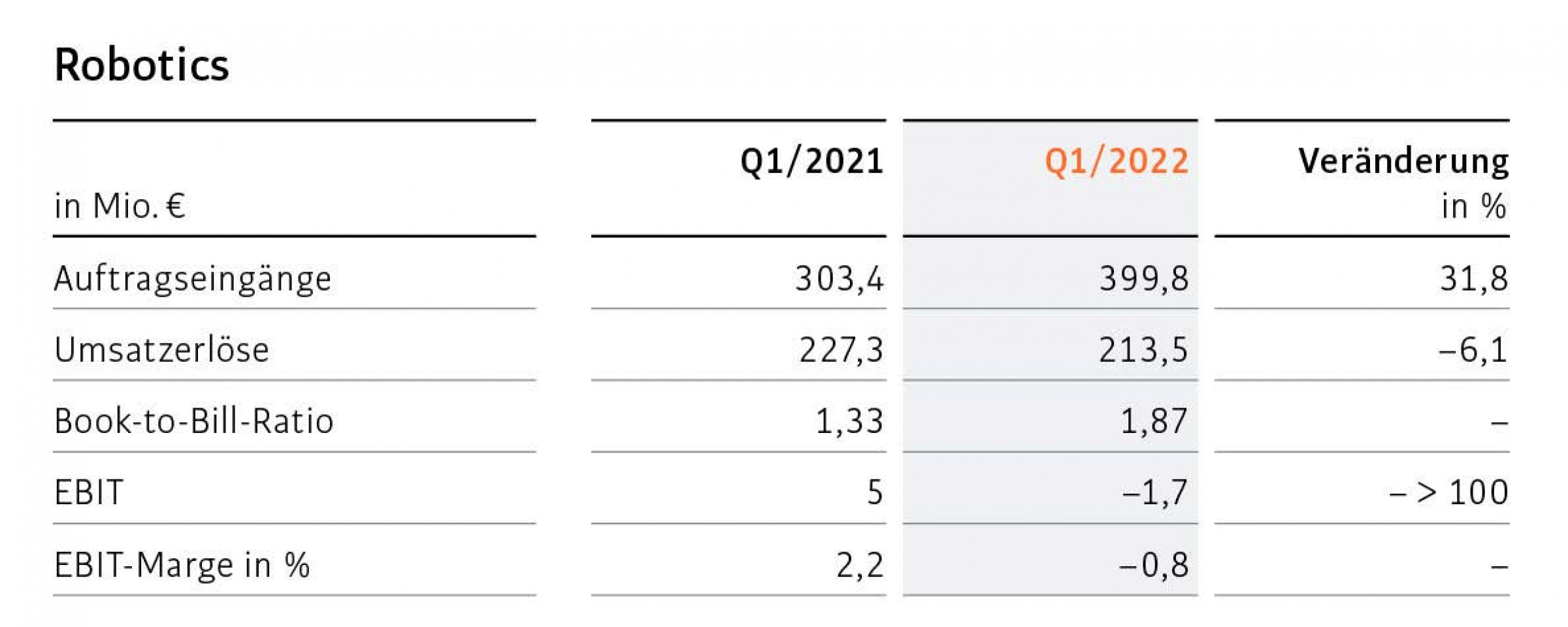 Die Division Robotics erzielte mit Aufträgen im Wert von fast 400 Mio. € den bisher höchsten Quartalswert. Dabei gewann Robotics nicht nur Kunden im klassischen Automobil-Bereich, sondern eroberte auch Aufträge in wachsenden Märkten der General Industry, wie Consumer Goods.