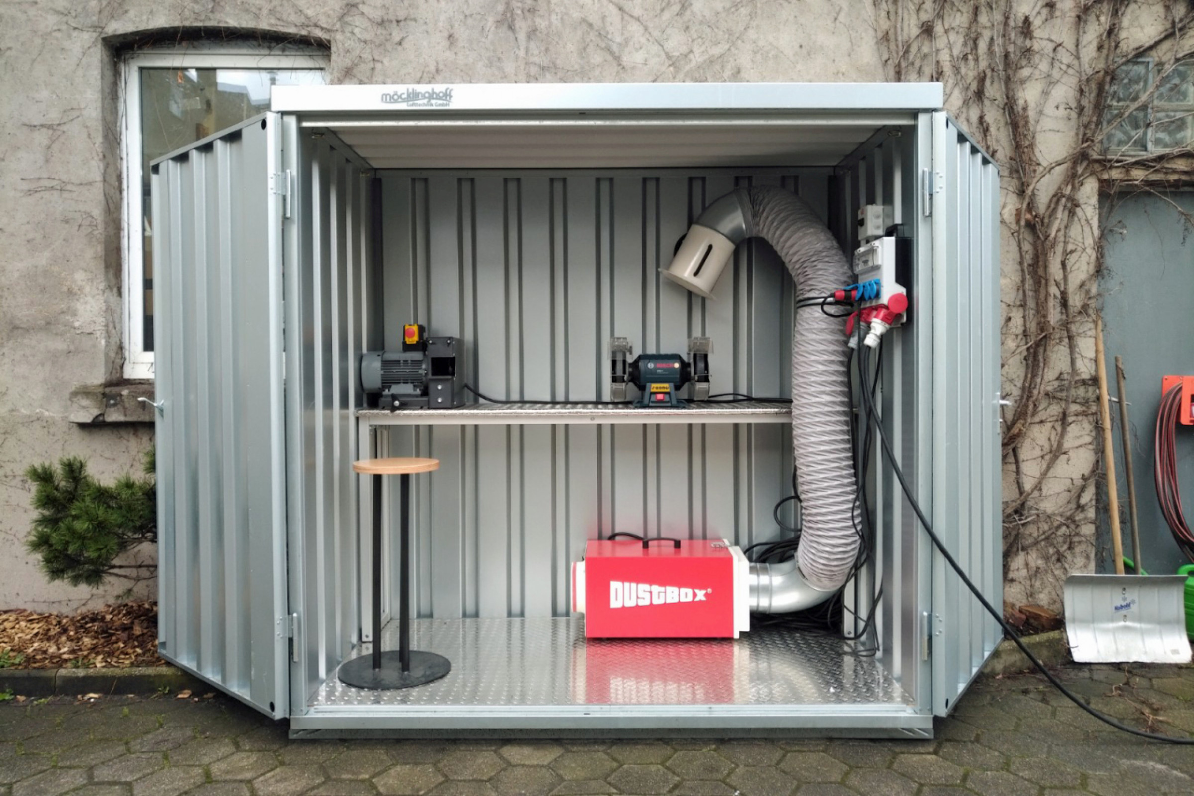 Möcklinghoff Lufttechnik begegnet den unterschiedlichen Größen staubbelasteter Räume mit drei Varianten seines Luftreinigers: DustBox 1000, 2000 und 6000 spielen ihre Stärken in maximal 12 qm, 24 qm und 100 qm großen Arbeitsbereichen aus. Ob im Umluftbetrieb, mit Abluft- oder Absaugschlauch, mit Punkterfassung oder Unterdruckhaltung – alle Typen erfüllen die Anforderungen der Staubklasse H, sind robust, mobil und universell für Baustellen und Industriebereiche einsetzbar. Die BG BAU fördert die Anschaffung einer DustBox.