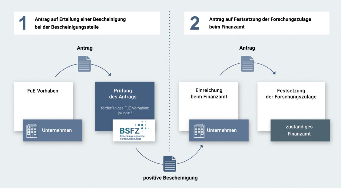 Wer von der Forschungszulage profitieren möchte, muss zunächst eine Bescheinigung darüber vorlegen, dass das Unternehmen ein förderfähiges Forschungsvorhaben im Sinne des Forschungszulagengesetzes durchführt. Diese Bescheinigung erhalten die Unternehmen bei der sogenannten Bescheinigungsstelle Forschungszulage – mittels eines vollständig digitalisierten Verfahrens über deren Website.