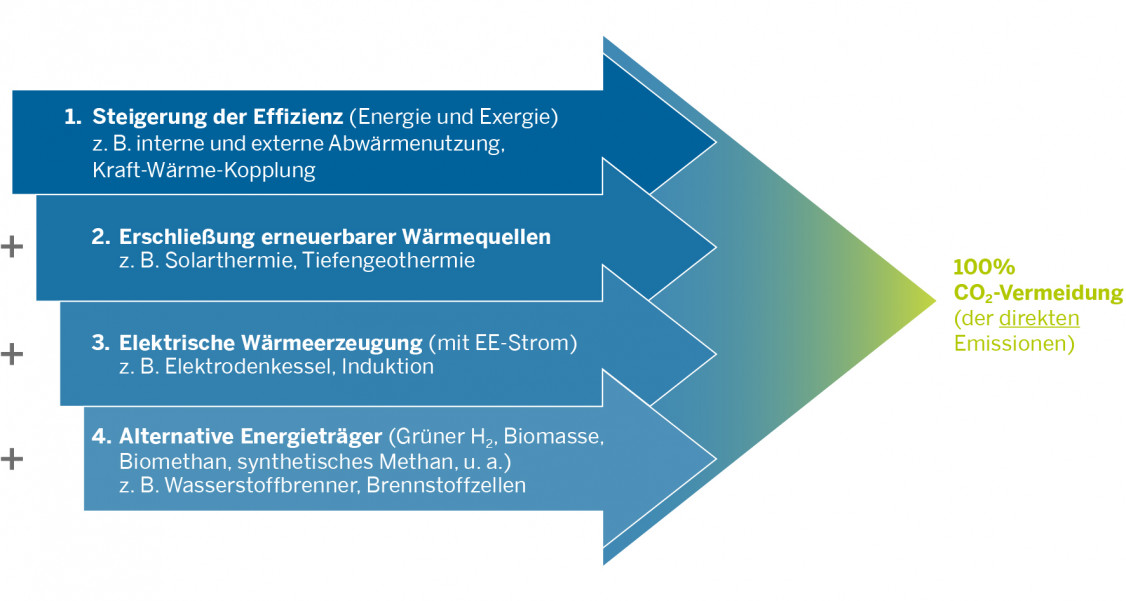 - Stufe 2: Erschließung regenerativer Wärmequellen wie Solar- oder Geother-mie, wo es Standort und Temperaturniveau ermöglichen