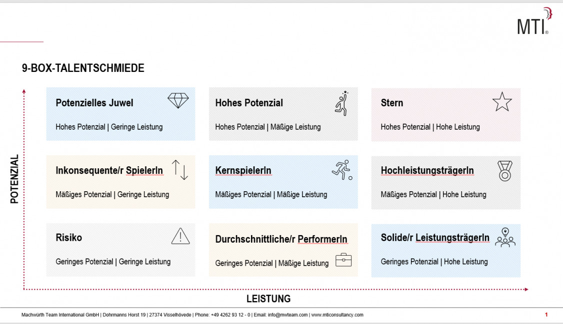 Aufgabe der Führungskräfte ist es, diese Potenzialträger zu identifizieren. Zudem empfehlen sich vom HR-Bereich moderierte Personaldurchsprachen, die unter anderem der Einordnung der Beschäftigten in das 9-Box-Model dienen (siehe Grafik 1).