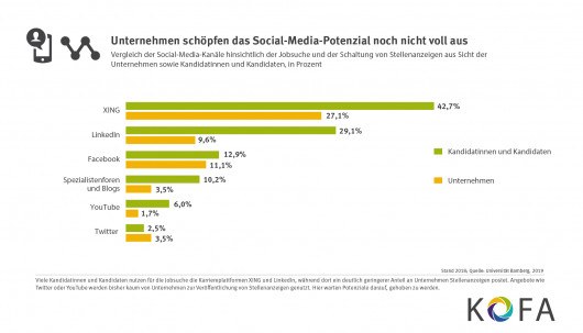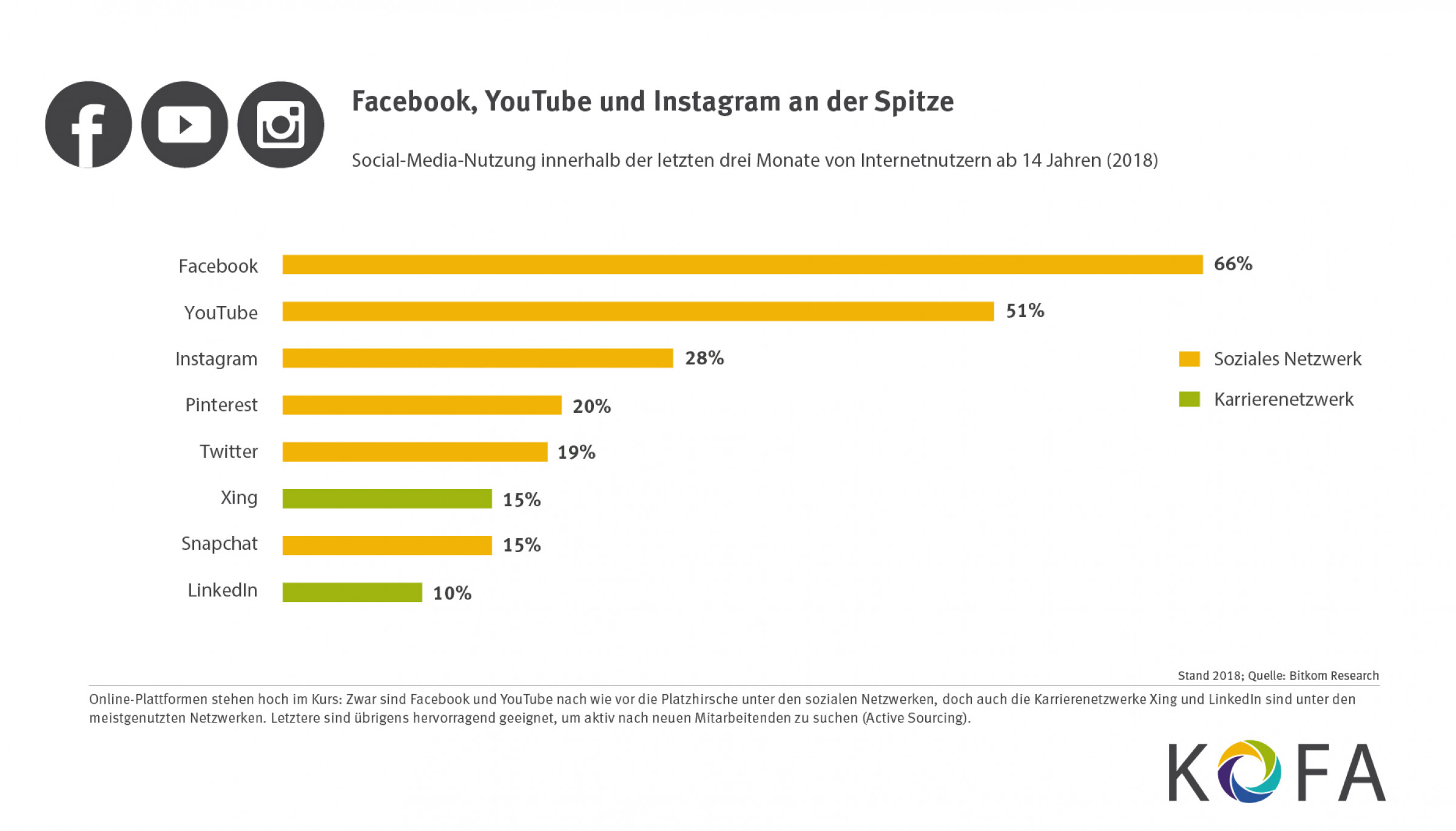 Berufsbezogene Social-Network Plattformen, wie Xing oder LinkedIn eignen sich gut für eine Direktansprache von potenziellen Kandidatinnen und Kandidaten. Private Social-Network Plattformen, wie z. B. Facebook oder die meisten Social-Media Plattformen, wie Instagram, Twitter oder YouTube werden eher privat genutzt. Dennoch können Sie auch diese Plattformen zur Rekrutierung nutzen, z. B. indem Sie mit einem Imagefilm oder interessanten Informationen zu Ihrem Unternehmen auf diesen Plattformen für sich werben.