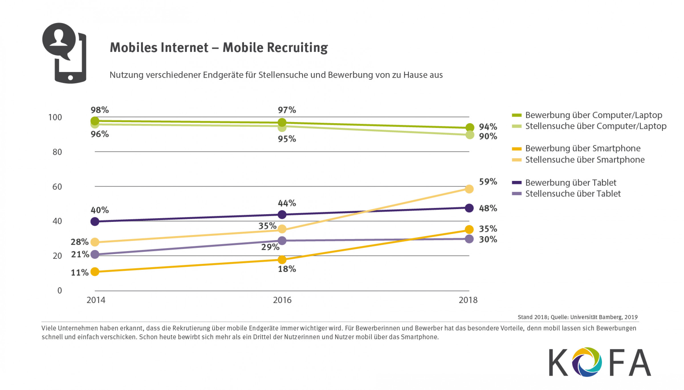 Mit Mobile Recruiting ist die Mitarbeitersuche über mobile Endgeräte, wie dem Tablet oder dem Smartphone gemeint. Da immer mehr Menschen das Smartphone nutzen, um sich im Internet zu informieren, ist es wichtig, dass Sie Ihre Webseite für die Darstellung auf mobilen Endgeräten anpassen.