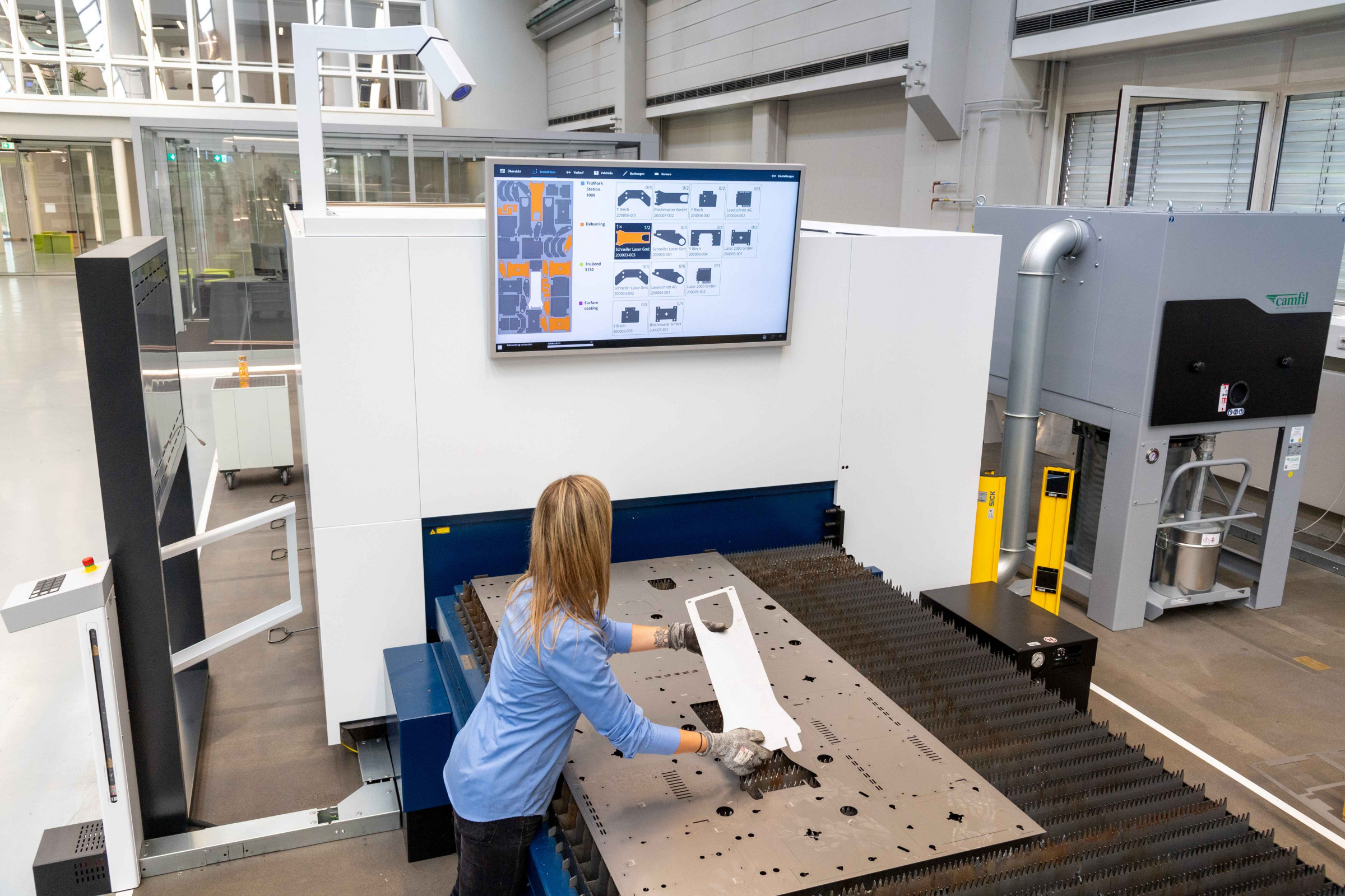 Die Smart Factory von TRUMPF dient nicht nur der hauseigenen Fertigung, sondern auch als Vorführzentrum für Blechbearbeiter aus Deutschland und ganz Europa. Sie können sich dort Effizienzverbesserungen beim Schneiden, Biegen, Stanzen und Schweißen in einer realen Produktion ansehen. Sowohl kleine, mittelständische als auch große Unternehmen finden dort neue Vernetzungslösungen für ihre Produktion. So können etwa kleine Firmen durch Einstiegslösungen wie beispielsweise einen KI-basierten Absortierassistenten zu wesentlich besseren Ergebnissen kommen.