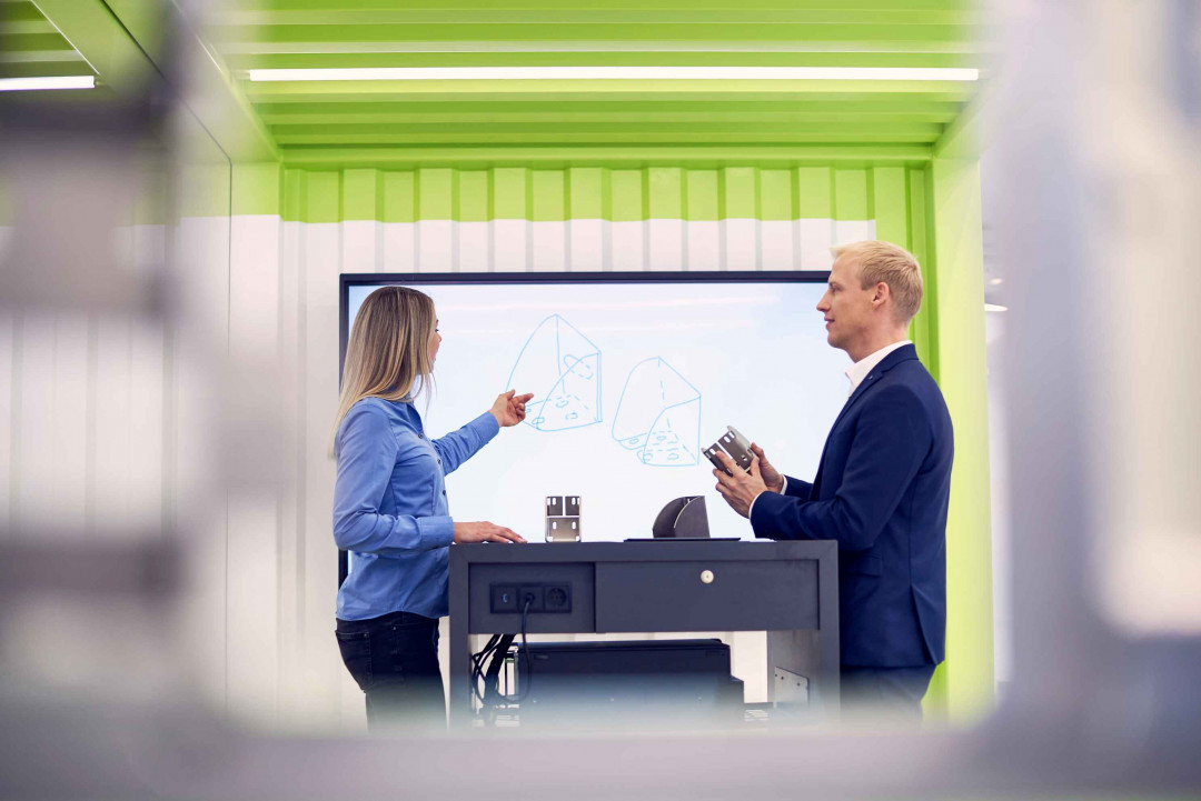 TRUMPF demonstriert in der Smart Factory, wie Kunden ihre Fertigung schrittweise weiter vernetzen können, beispielsweise in der Logistik. Vertreter von Unternehmen mit einem großen Maschinenpark können innerhalb der TRUMPF Smart Factory eine teilautonome Fertigung sehen. Dort greifen Stanz-, Laser- und Biegeprozesse sowie ein Lager nahtlos ineinander.