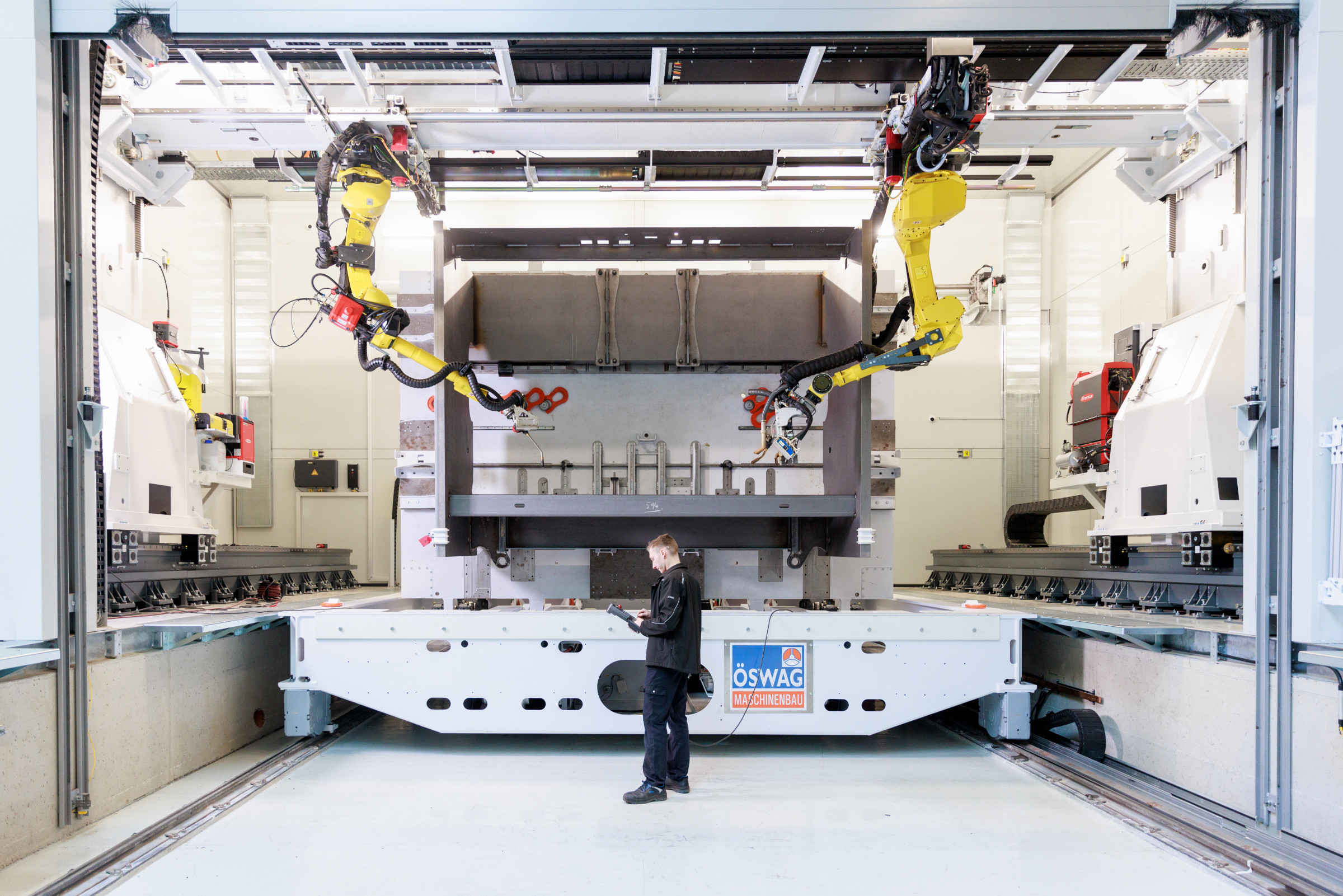 Deshalb entschied man sich für eine Zwei-Stationen-Portalanlage mit je einem LaserHybrid- und einem MAG-Schweißroboter sowie zwei großen Kipp-Positionierern, die eine waagerechte Bauteilzuführung ermöglichen. Während ein Maschinenrahmen geschweißt wird, kann auf dem freien Positionierer der nächste aufgespannt werden.