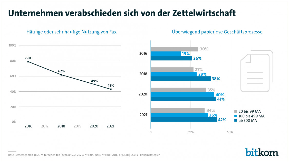 Auch die Büro- und Verwaltungsprozesse insgesamt werden stärker digitalisiert. Britze: „Die Zettelwirtschaft verschwindet langsam, aber sicher aus den Unternehmen.“ So liefen 2016 in jedem dritten Unternehmen (34 Prozent) die meisten Geschäftsprozesse papierbasiert ab, 2021 noch in knapp jedem Vierten (23 Prozent). Umgekehrt wird in einem Drittel der Unternehmen (34 Prozent) überwiegend papierlos gearbeitet, deutlich mehr als noch vor fünf Jahren (2016: 27 Prozent).