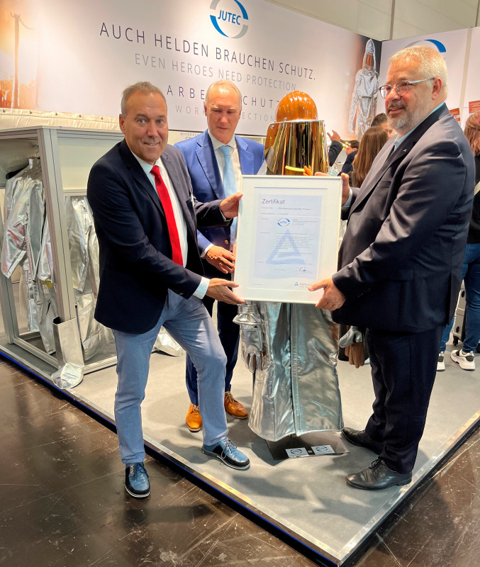 TÜV Rheinland has certified JUTEC’s new “HEAT PROTECTION compact” process. The certificate was officially handed over at the A+A 2023 Trade Fair for Safety and Health at Work in Düsseldorf by Olaf Seiche, Regional Business Field Manager and Registered Manager of TÜV Rheinland Cert GmbH. The safety check developed by JUTEC is a step-by-step process that helps safety officers in industries with heat-exposed working environments ensure that their colleagues receive the best possible heat protection.