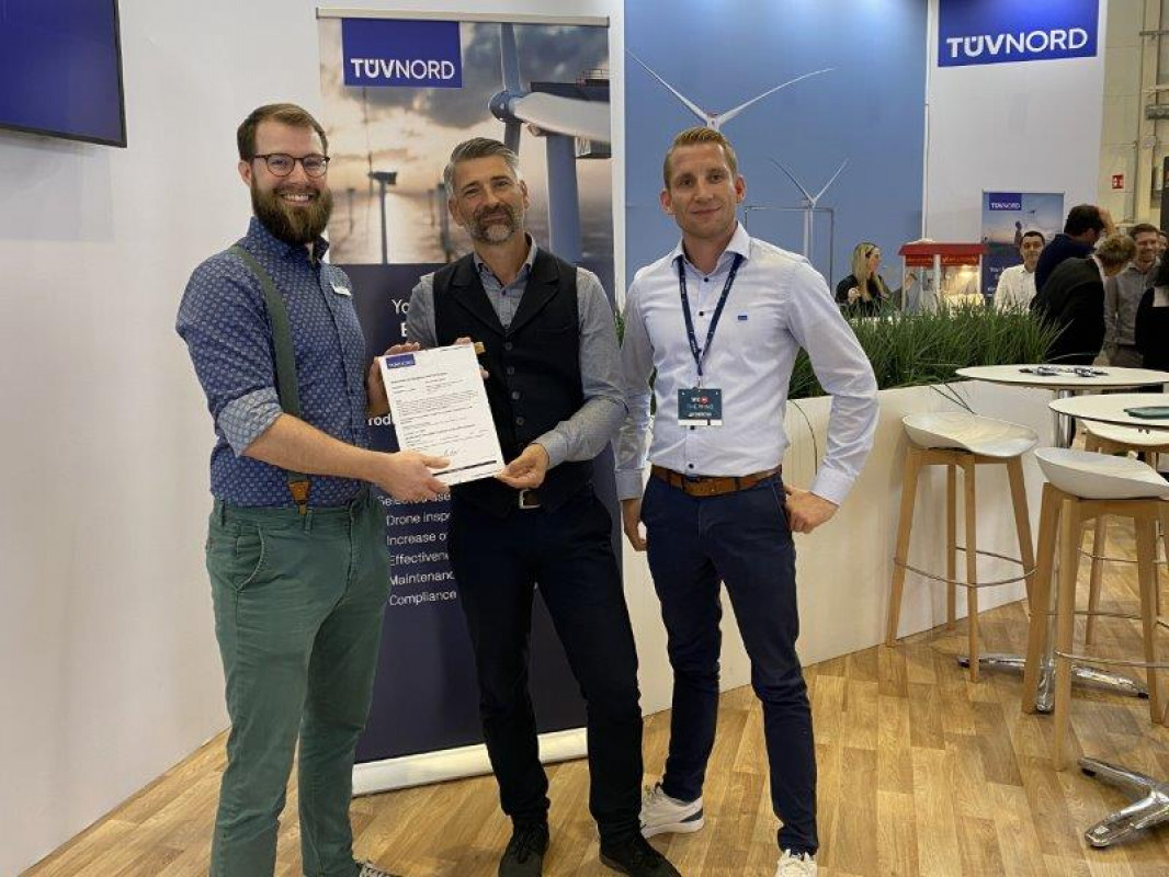 Übergabe der Verifizierung an die Deutsche Windtechnik auf der WindEnergy Hamburg mit Helge Brau, Project Manager Drone Inspection bei Deutsche Windtechnik, Michael Lange, Head of Rotor Blade and Electrical Components bei TÜV NORD, und Markus Sinnigen, Expert for electrical components and lightning protection systems bei TÜV NORD (v.l.n.r.). - © Deutsche Windtechnik