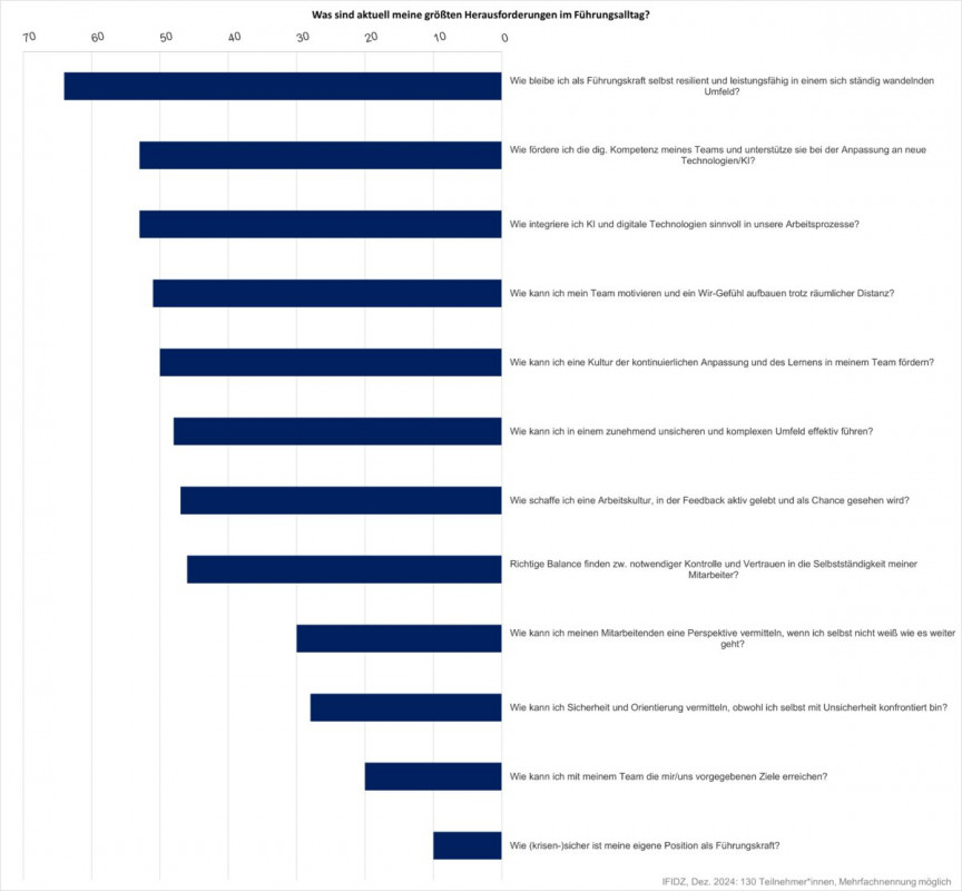 Entsprechend unterschiedlich sind die Herausforderungen, vor denen die Führungskräfte in den Unternehmen aktuell in ihrem Arbeitsalltag stehen. Deshalb hat das Institut für Führungskultur im digitalen Zeitalter (IFIDZ), Wiesbaden, seine jüngste Online-Befragung von Führungskräften, die es mehrmals pro Jahr durchführt, unter die Überschrift „Die größten Herausforderungen von Führungskräften 2025“ gestellt. Konkret heißt dies, das Institut wollte in der Leadership-Trendbarometer genannten Befragung ermitteln,