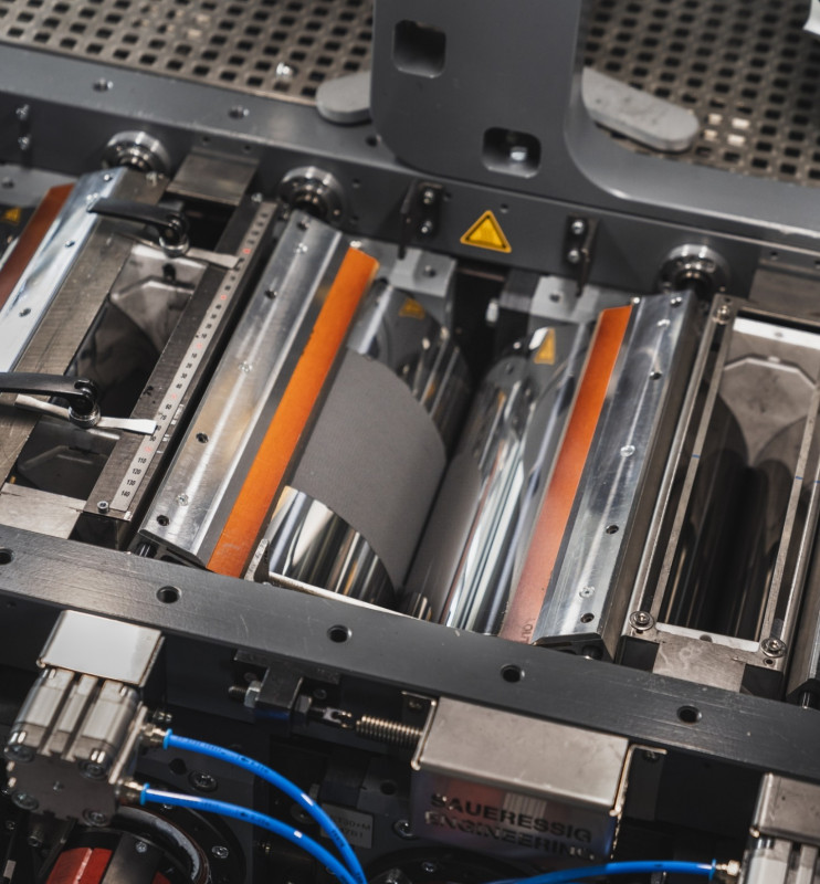 Für das neue Beschichtungsverfahren werden grundsätzlich ähnliche Ausgangsstoffe wie in den Slurry-Ansätzen verwendet. Die Trockenvariante des Fraunhofer IWS kommt dabei ohne Lösungsmittel aus, setzt dafür aber auf einen speziellen Binder. Zusammen bilden die Materialien ein Pulver, das in einen Kalanderspalt, also einen Spalt zwischen zwei entgegengesetzt rotierende Walzen, gegeben wird. Entscheidend ist, dass sich eine der Walzen dabei schneller dreht als die andere. So entsteht eine Scherkraft, die dafür sorgt, dass der Binder fadenförmige Netzwerke, sogenannte Fibrillen, ausbildet. „Man kann sich das in etwa wie ein Spinnennetz vorstellen, das die Partikel mechanisch verankert“, beschreibt Schumm. Auf der schneller rotierenden Walze bildet sich durch Druck und Bewegung ein feiner Film. Dieser wird anschließend in einem zweiten Kalanderspalt auf eine Stromableiterfolie übertragen. Hierbei können ohne großen Mehraufwand auch beide Seiten gleichzeitig beschichtet werden. Im letzten Schritt wird die entstandene Rolle dann je nach Bedarf zugeschnitten und die einzelnen Teile entsprechend gestapelt, um so die fertige Batteriezelle zu erzeugen.
