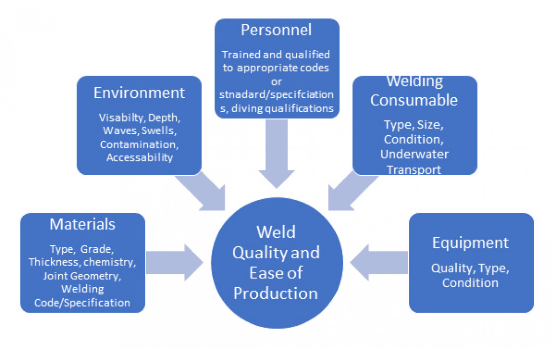 There are several different factors influencing the quality and the ease of production of underwater wet welding. The figure below gives an overview of the most important factors in question. In the following subsections of the influencing factors are briefly discussed.