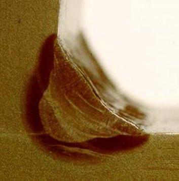 Underwater wet welding can be performed, as top site welding in all positions, flat, horizontal, vertical and overhead, with welding performed vertically, the progression will be downward (downhill). Due to the emerging upward traveling bubbles, the diver would not be able to see the weld joint. Welding downhill underwater will produce, unlike on top site a deep penetration, as shown in photograph below. Due to the fast-freezing weld puddle, welding downhill underwater will also be performed at a relatively slow travel speed.