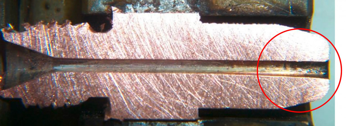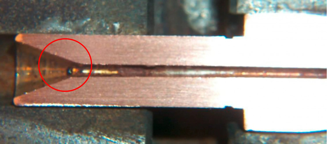 → Die Folge: Festgesetzter Abrieb am Einlauf der Stromdüse oder Förderung des Abriebs durch die Stromdüse, unruhige Lichtbögen entstehen, Draht kann festbrennen