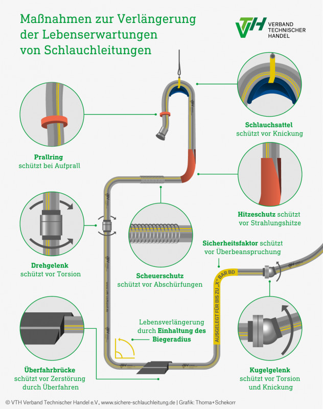 Um die Lebensdauer von Schlauchleitungen zu erhöhen, führt der Technische Handel zahlreiche Hilfsmittel im Programm, die durch ihre Schutzfunktion die Belastungen auf den Schlauch und die Armatur verringern. So kann er seine Kunden hinsichtlich folgender Schutzmaßnahmen beraten: