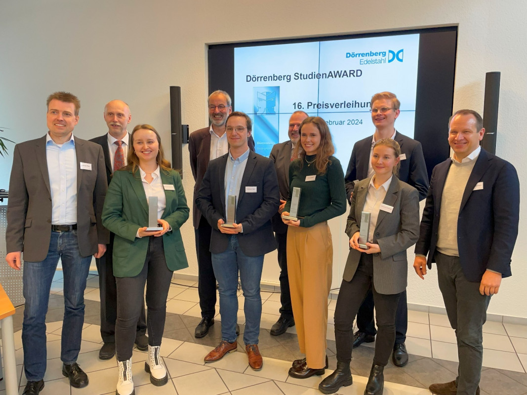 Am 15. Februar 2024 wurde in langjähriger Tradition der Dörrenberg StudienAWARD an Studierende verliehen, die sich in ihrem Studium mit werkstofftechnischen Fragen zum Thema Stahl, Wärmebehandlung, Oberflächentechnik oder Verfahrensprozessen beschäftigt haben.