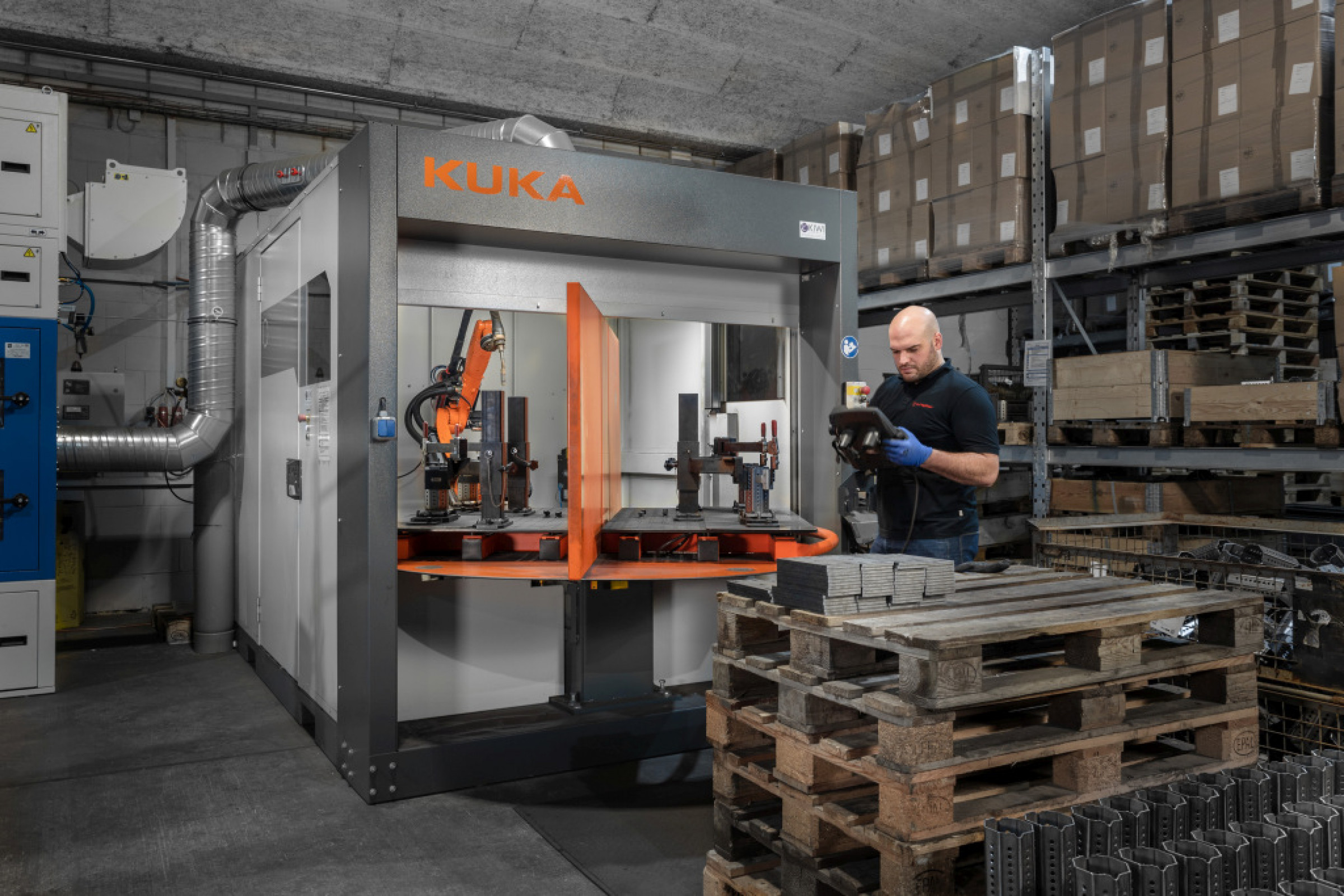 Dass eine Verzinkerei Stahlteile verschweißt, ist ungewöhnlich. Die Kernkompetenz von Verzinkereien liegt im Feuer- oder Schleuderverzinken, um Stahlteile vor der Korrosion zu schützen. Doch die Verzinkerei Sulz GmbH aus Sulz am Neckar im Schwarzwald hat mit ihrer KUKA Schweißzelle noch mehr zu bieten. Wer den KR CYBERTECH nano bei der Arbeit beobachtet, würde nicht annehmen, dass diese Art von Auftrag hier ein Novum ist. Souverän und präzise verbindet der Roboter mithilfe des Schweißgeräts das achteckige Prisma mit der kompakten Platte aus Stahl. Nach 90 Sekunden sind zwei Schweißvorgänge abgeschlossen. Ein Mitarbeiter entnimmt die fertigen Produkte und ersetzt sie durch zwei neue. „Die Qualität der Schweißnähte ist hervorragend“, freut sich Bernd D. Euschen, Geschäftsführer der Verzinkerei Sulz, über die roboterbasierte Lösung mit der KUKA Schweißzelle und dem KR CYBERTECH nano.