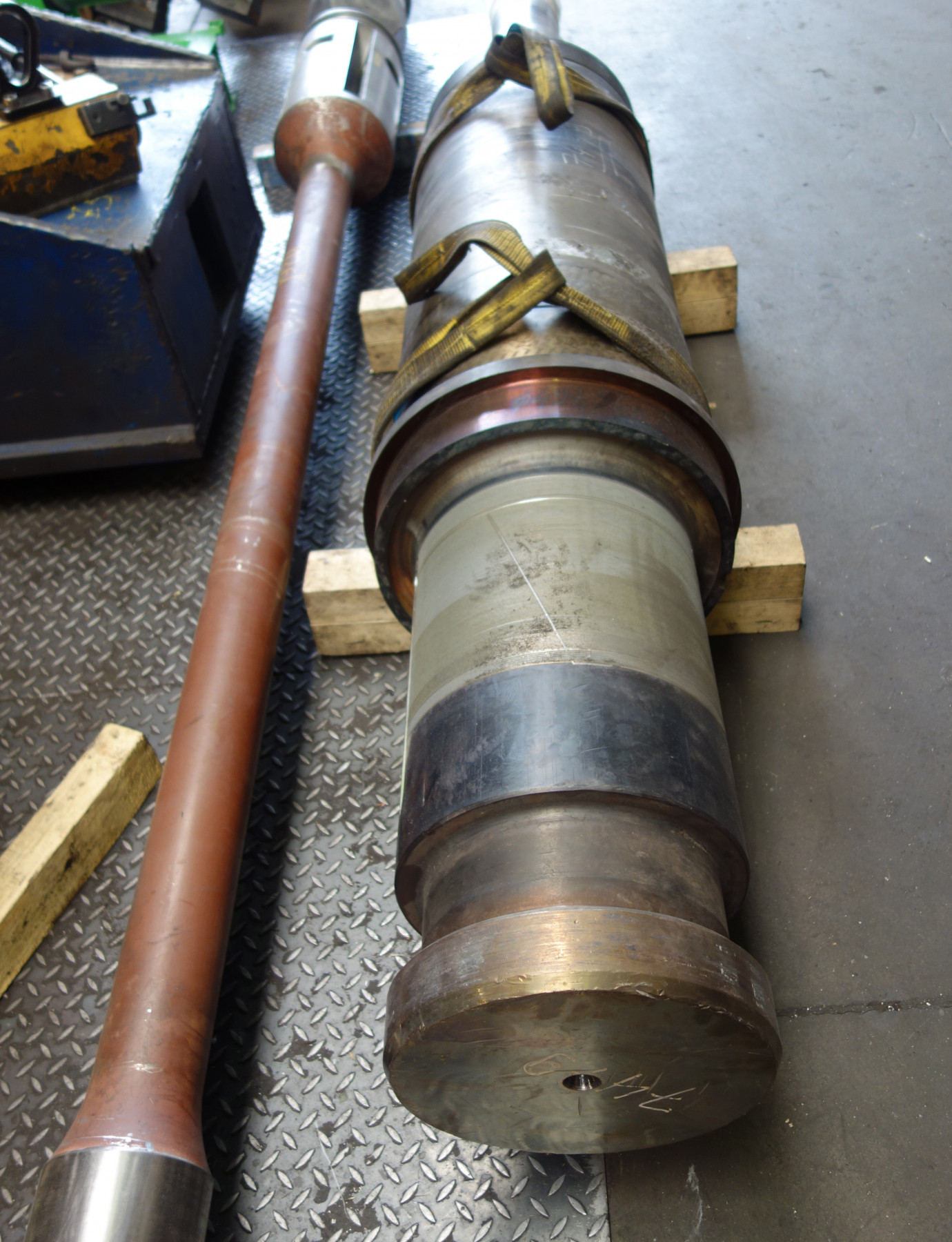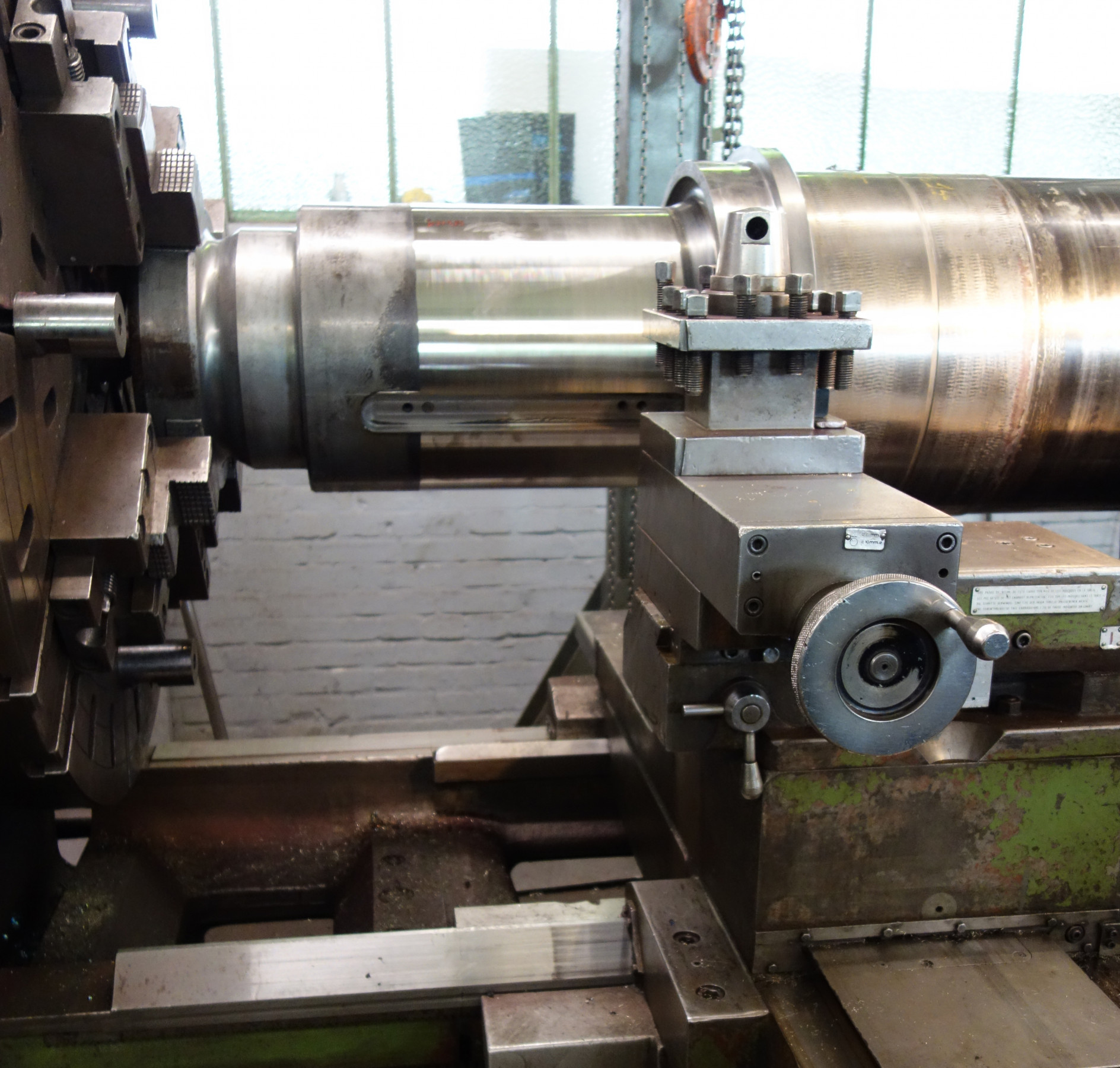 Der Traditionsbetrieb sagte eine Reparatur binnen zwei Monaten zu – angesichts der Komplexität der Aufgabenstellung und des anspruchsvollen Werkstoffs ein ambitioniertes Versprechen. Die Umsetzung erfolgte durch engmaschig im Unternehmen abgestimmte Bearbeitungsprozesse. So wurde das 440 x 4 Millimeter große Trapezgewinde nachgedreht und auf Maß gebracht. Außerdem wurden das Druck-Distanzstück inklusive einer 472 Millimeter-Bohrung erneuert, eine Reparaturhülse für den verschlissenen Sitz des Wellendichtrings nach Kundenwunsch gehärtet und der Richtwalzenkeil neu angefertigt. Hinzu kamen die vorbereitenden Arbeiten an der Richtachse: Vordrehen der Welle auf ein glattes Maß zum Schweißen und Vorfräsen der Passfedernuten.