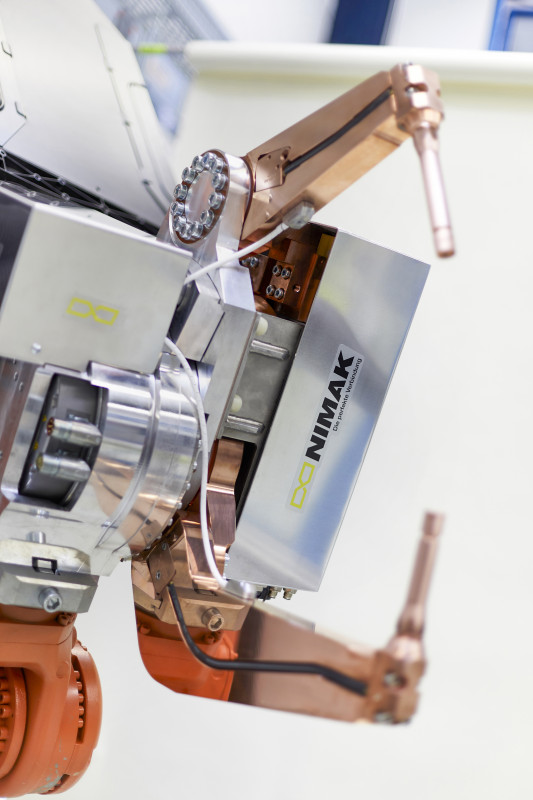 Darüber hinaus hat NIMAK im Jahr 2011 die erste Roboter-Schweißzange mit Kondensator-Entladung auf den Markt gebracht. Da diese keine Wasserkühlung und Druckluft benötig und mit einer sehr geringen Stromleistung auskommt, ist mit dieser Technik eine starke Reduzierung der Investitionskosten möglich.