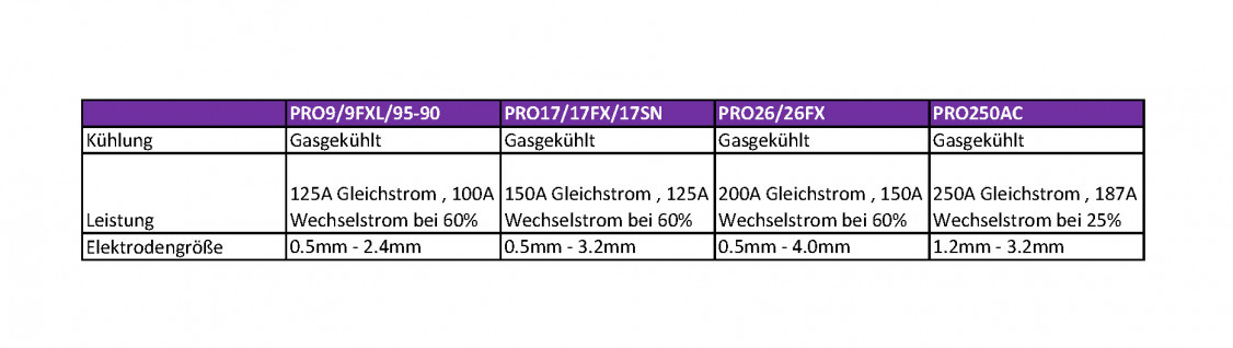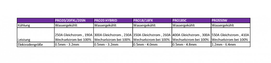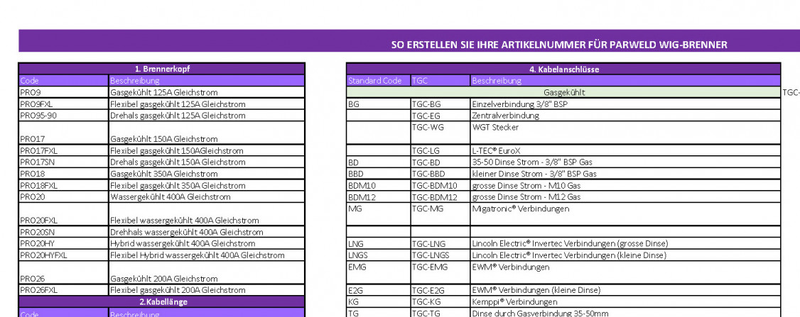 In der gezeigten Tabelle, sehen Sie die vielzähligen Konfigurationen unserer WIG Brenner, damit Sie diese genau an Ihre Bedürfnisse und Stromquellen anpassen können: