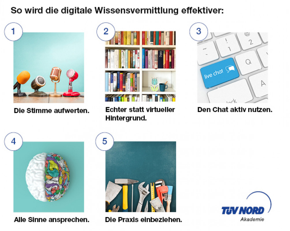 „Virtuelle Trainings bieten tatsächlich viel mehr Möglichkeiten, als man auf den ersten Blick vermutet“, betont Melanie Rudolph.„Wer sie gut plant und vielseitig ausgestaltet, ermöglicht Teilnehmenden auch rein digital ein bereicherndes Lernerlebnis.“ Weiterführende Informationen zum Wissenstransfer in Unternehmen sind im Wissensportal der TÜV NORD Akademie zu finden.